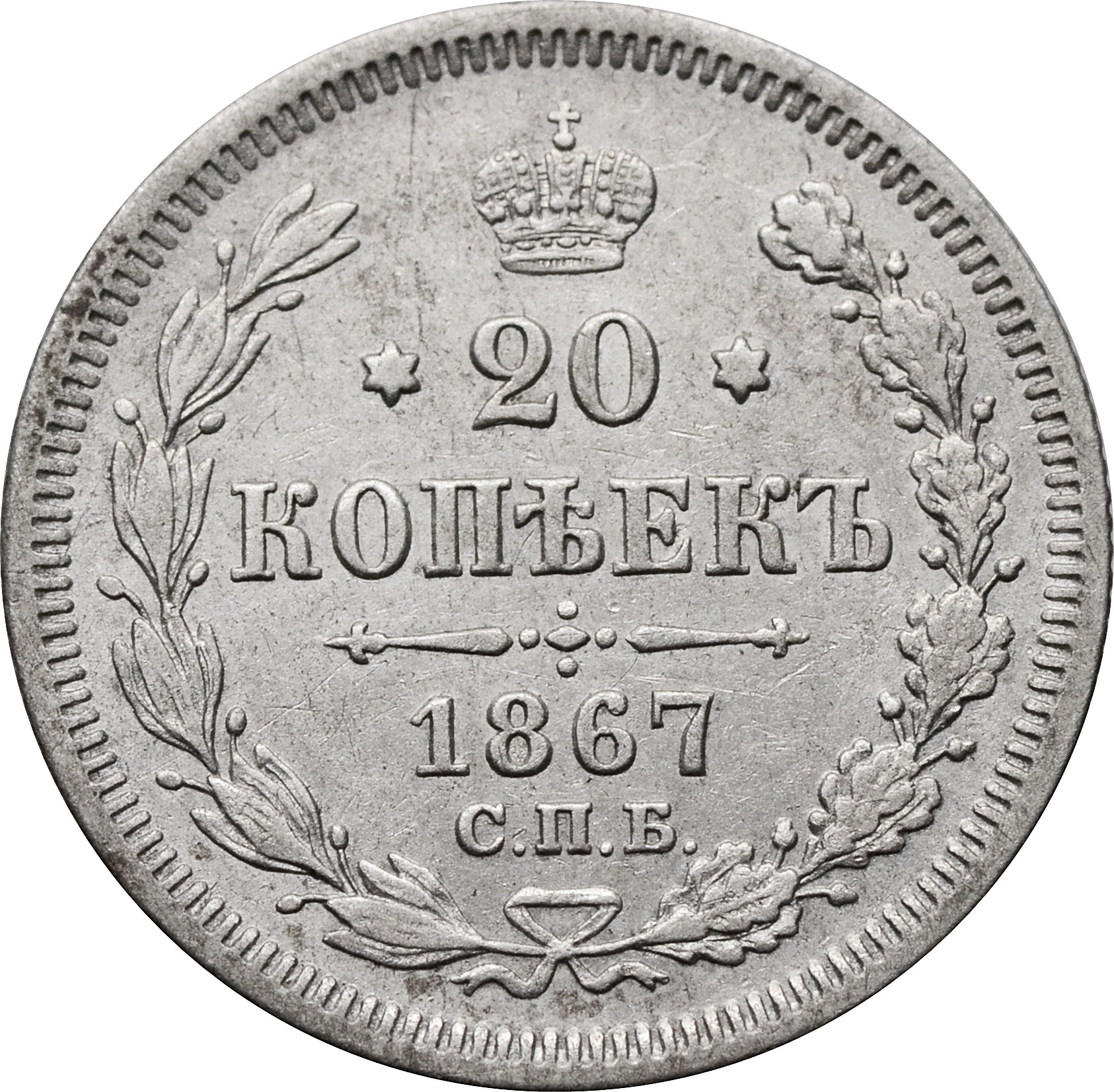 Реверс: по центру указан номинал: "20 КОПЕЕК". Ниже, расположен декоративный разделитель в виде двух разнонаправленных фигурных линий и стилизованным из точек крестом между ними. Под разделителем год чеканки монеты: "1867" и буквы монетного двора: "С.П.Б.".
