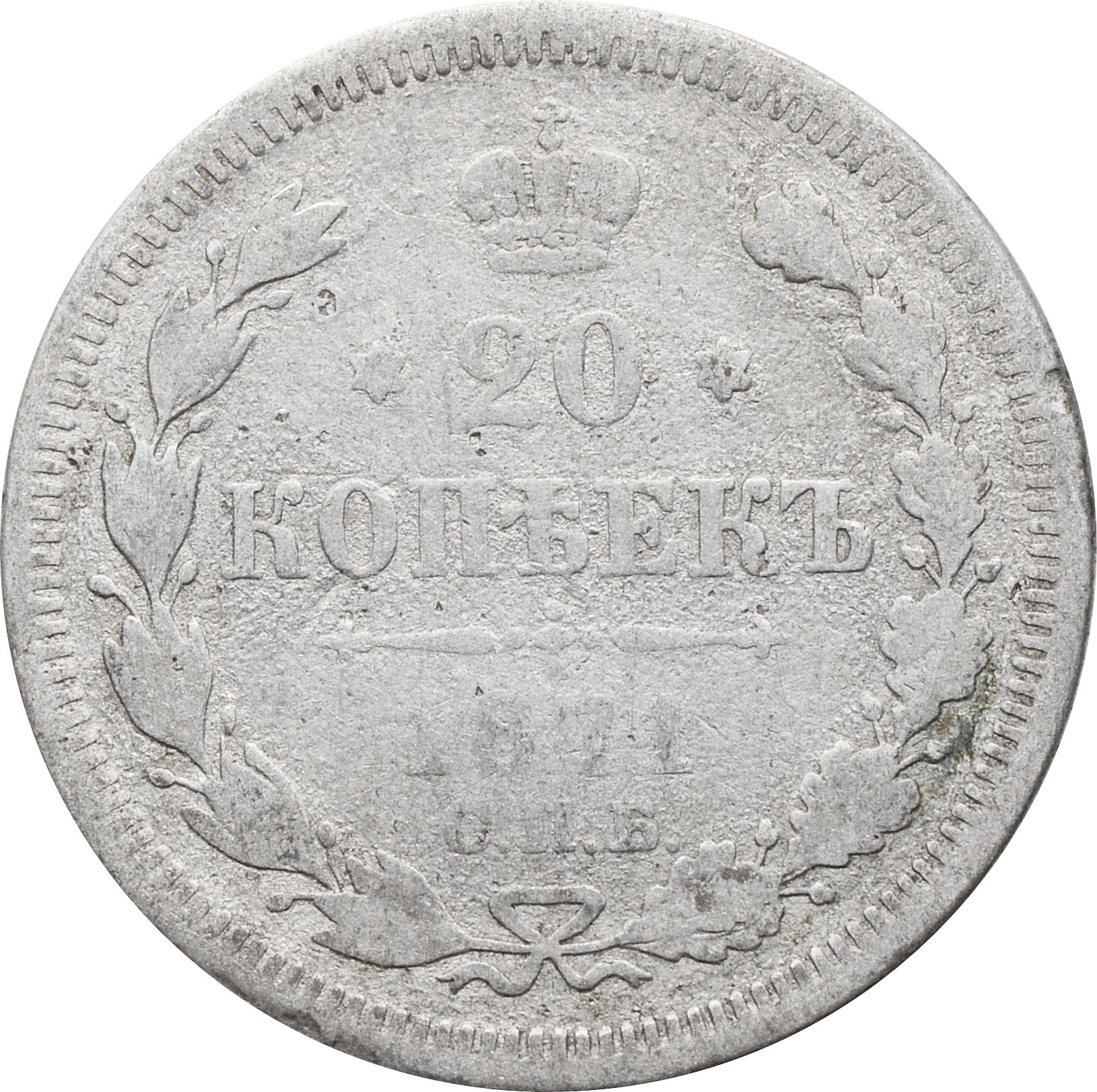 Реверс: по центру указан номинал: "20 КОПЕЕК". Ниже, расположен декоративный разделитель в виде двух разнонаправленных фигурных линий и стилизованным из точек крестом между ними. Под разделителем год чеканки монеты: "1871" и буквы монетного двора: "С.П.Б.".