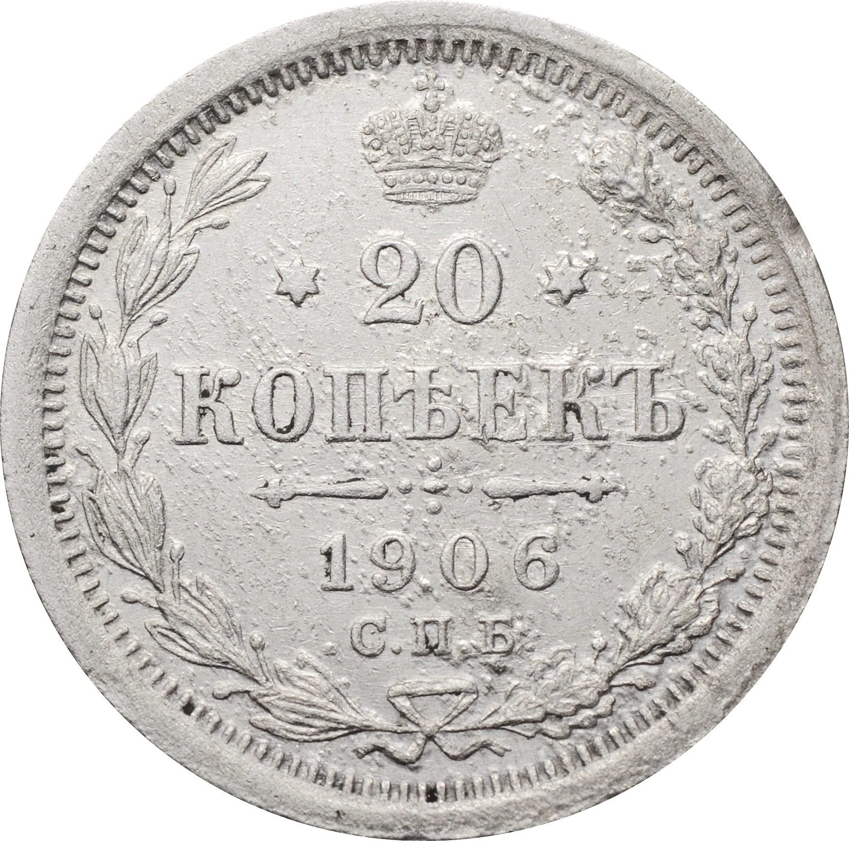 Реверс: по центру указан номинал: "20 КОПЕЕК". Ниже, расположен декоративный разделитель в виде двух разнонаправленных фигурных линий и стилизованным из точек крестом между ними. Под разделителем год чеканки монеты: "1906". Вдоль канта, изображен венок из лавровой и дубовой ветвей, которые, перевязаны лентой снизу.