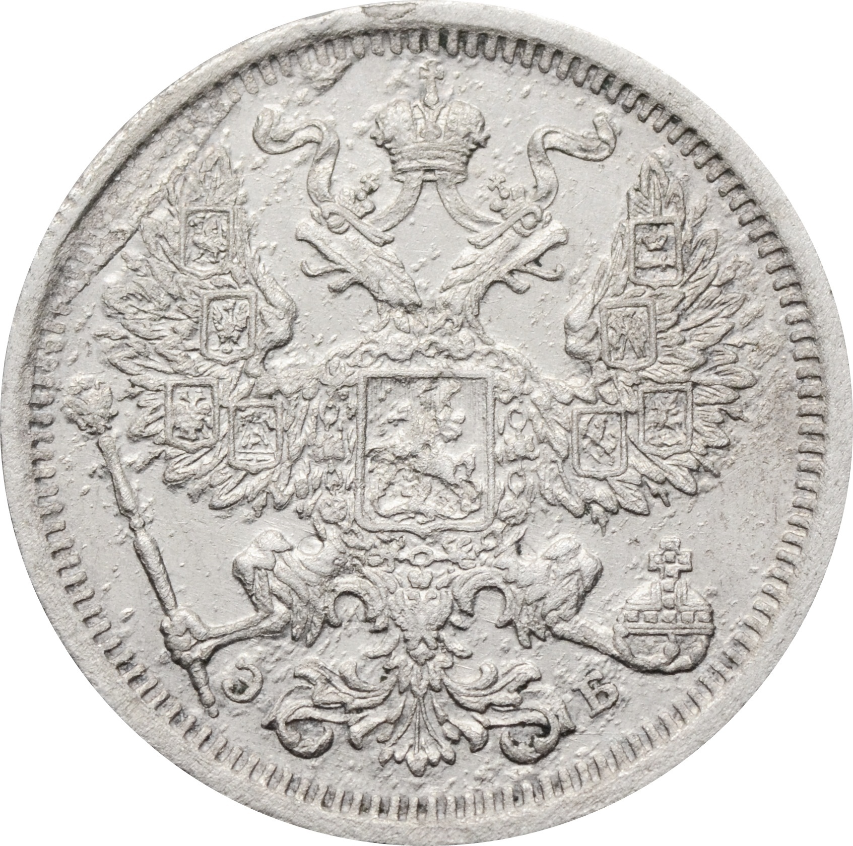 Аверс: в центре монеты изображен двуглавый орёл - малый государственный герб Российской Империи. Головы орла увенчаны двумя коронами, третья, большая корона над ними, а на груди расположен Московский герб - щит с изображением Георгия Победоносца, поражающего копьем дракона. На крыльях изображены гербы княжеств - Киевского, Новгородского и Владимирского, а так же Царства Казанского, Польского, Херсонеса Таврического, Астраханского, Сибирского, Грузинского. В правой лапе орла – скипетр, а в левой – держава. Под правой лапой буква - "Э", под левой – "Б" (минцмейстер Эликум Бабаянц).