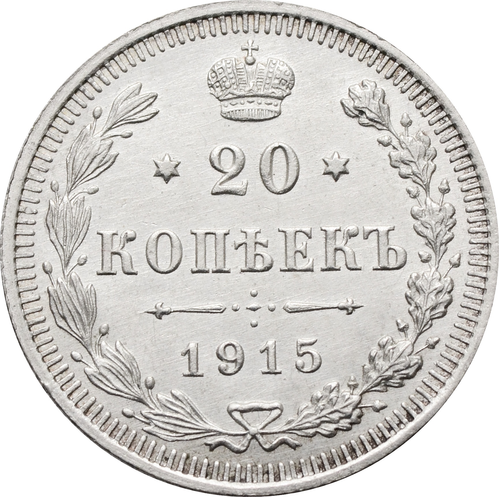 Реверс: по центру указан номинал: "20 КОПЕЕК". Ниже, расположен декоративный разделитель в виде двух разнонаправленных фигурных линий и стилизованным из точек крестом между ними. Под разделителем год чеканки монеты: "1915". Вдоль канта, изображен венок из лавровой и дубовой ветвей, которые, перевязаны лентой снизу.