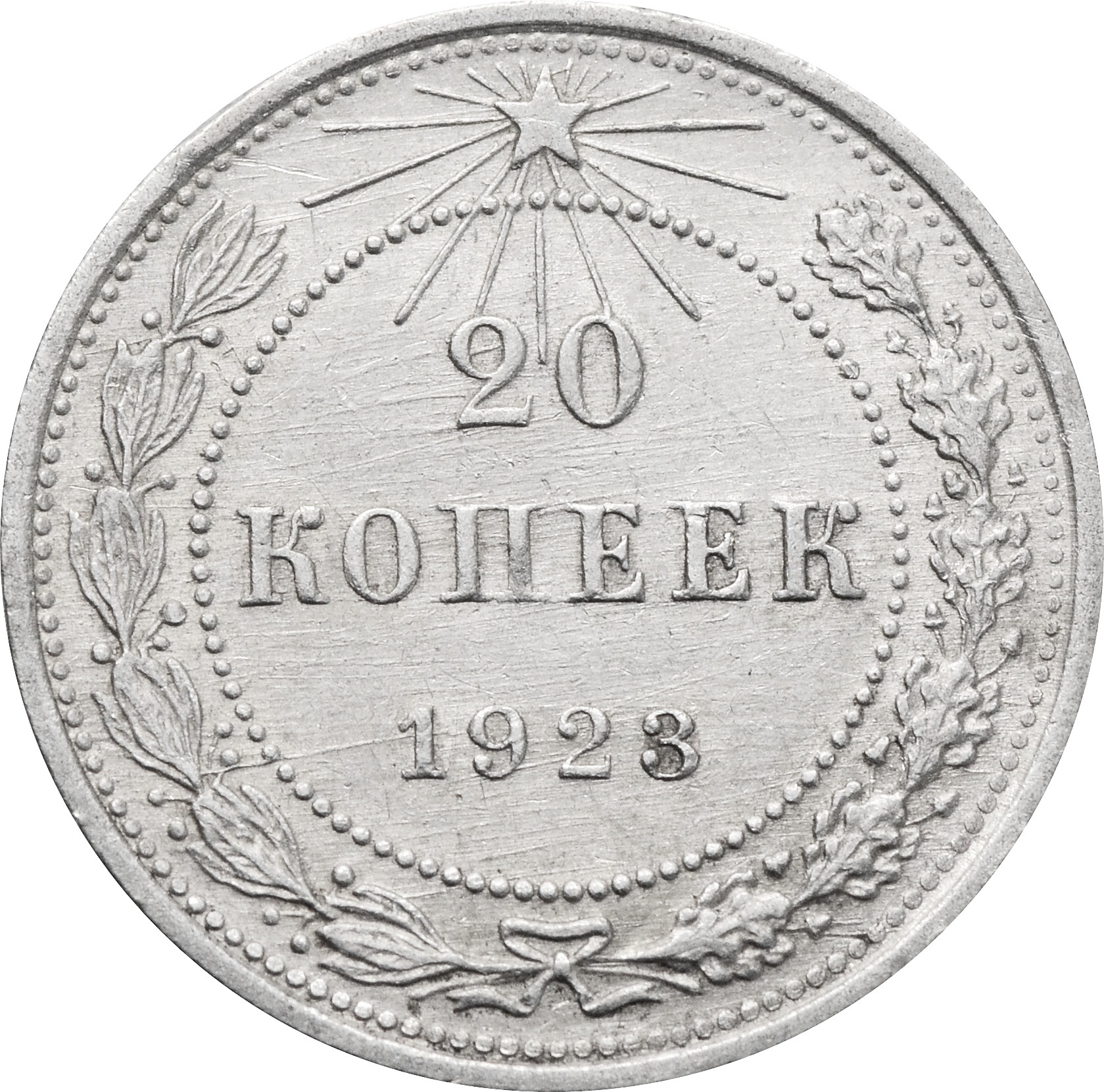 Реверс: по центру монеты указан номинал в две строки: "20 копеек". Ниже год чеканки монеты: "1923". Под годом чеканки, вдоль канта, расположен импровизированный венок. Сверху изображена пятиконечная звезда.