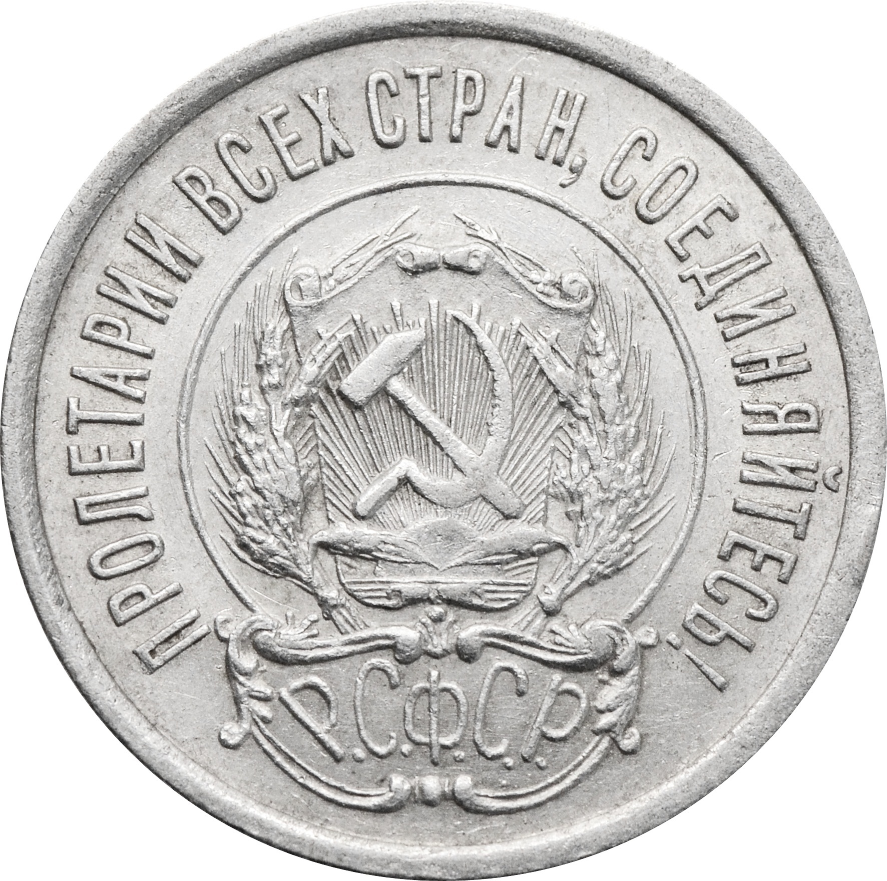 Аверс: в центре монеты расположен герб РСФСР. Под ним расположена аббревиатура государства: "Р.С.Ф.С.Р.". Вдоль канта, по кругу, расположена надпись: "ПРОЛЕТАРИИ ВСЕХ СТРАН, СОЕДИНЯЙТЕСЬ!".