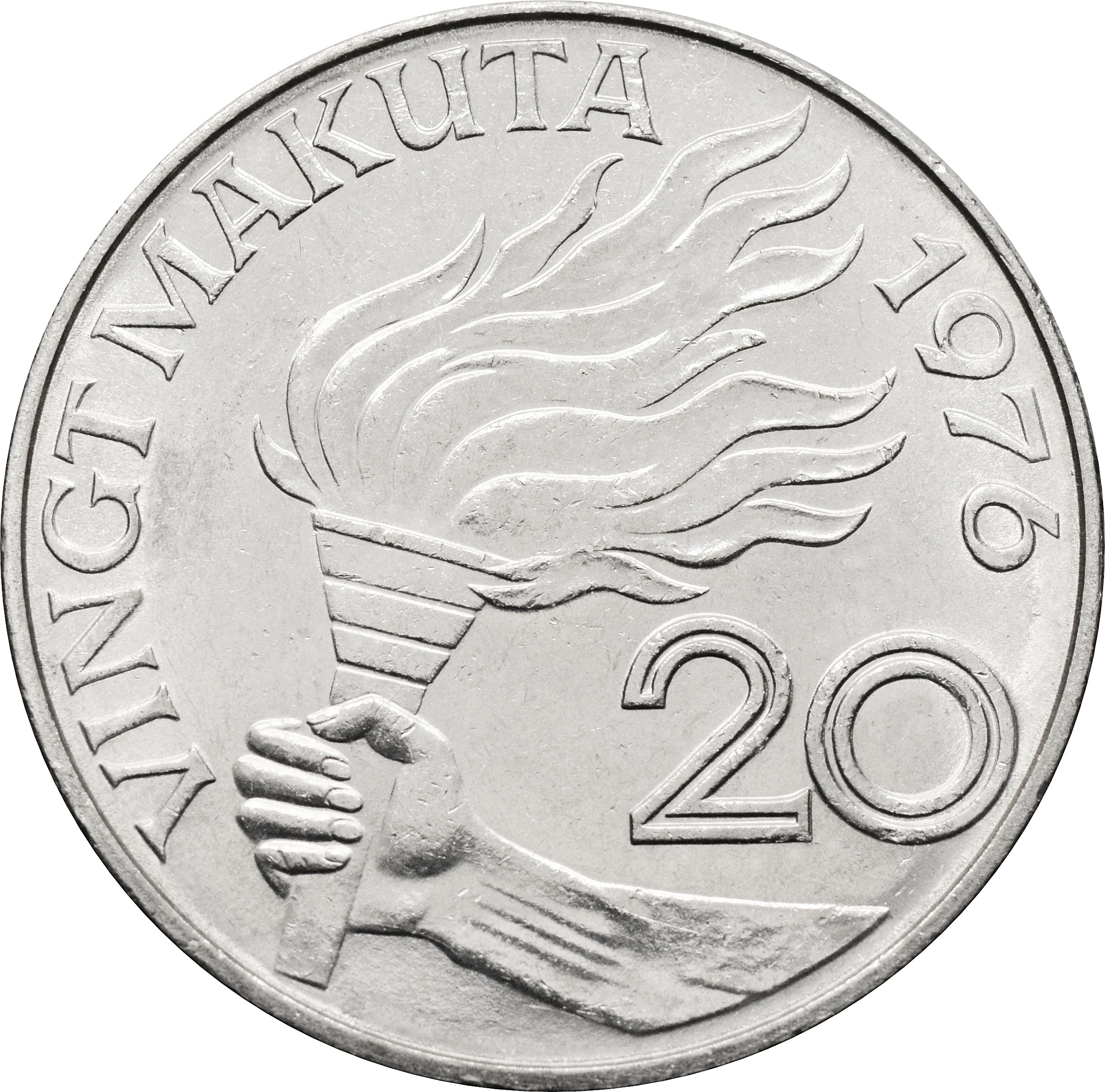 Реверс: в центре монеты изображен факел с флага страны и указан номинал: "VINGT 20 MAKUTA". Выше год чеканки монеты: "1976".