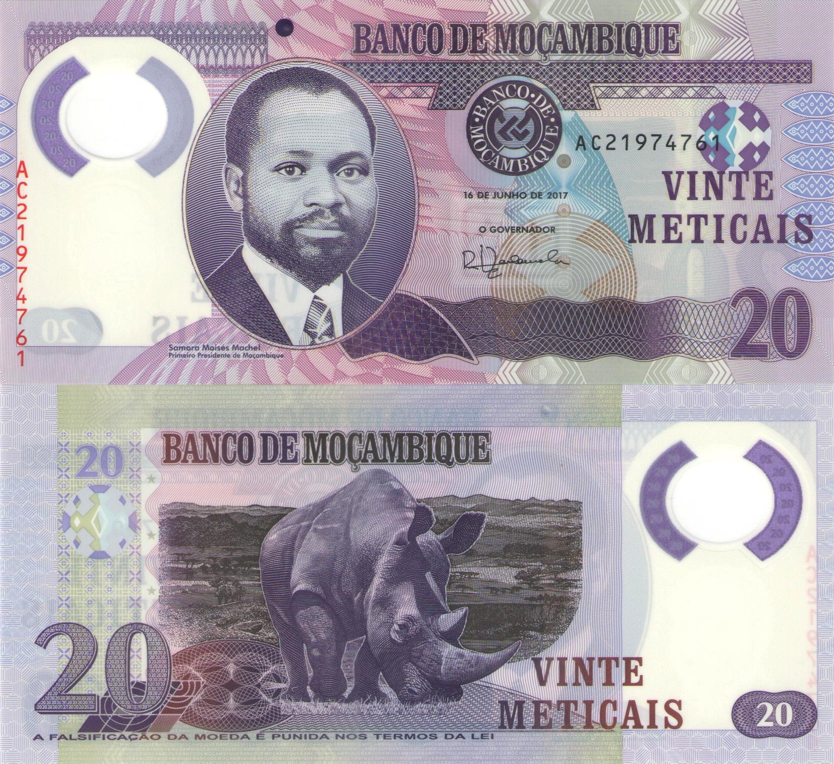 Лицевая сторона: в правой части боны размещен портрет Самора Мойзеша Машела (1933-1986) - первый президент Мозамбика. Сверху надпись: "BANCO DE MOCAMBIQUE". Ниже серийный номер продублированный справа. В правом верхнем углу указан номинал цифрой - "20", а в левом нижнем углу номинал цифрой и прописью: "20 VINTE METICAIS". По центру дата: "16 DE JUNHO DE 2017".