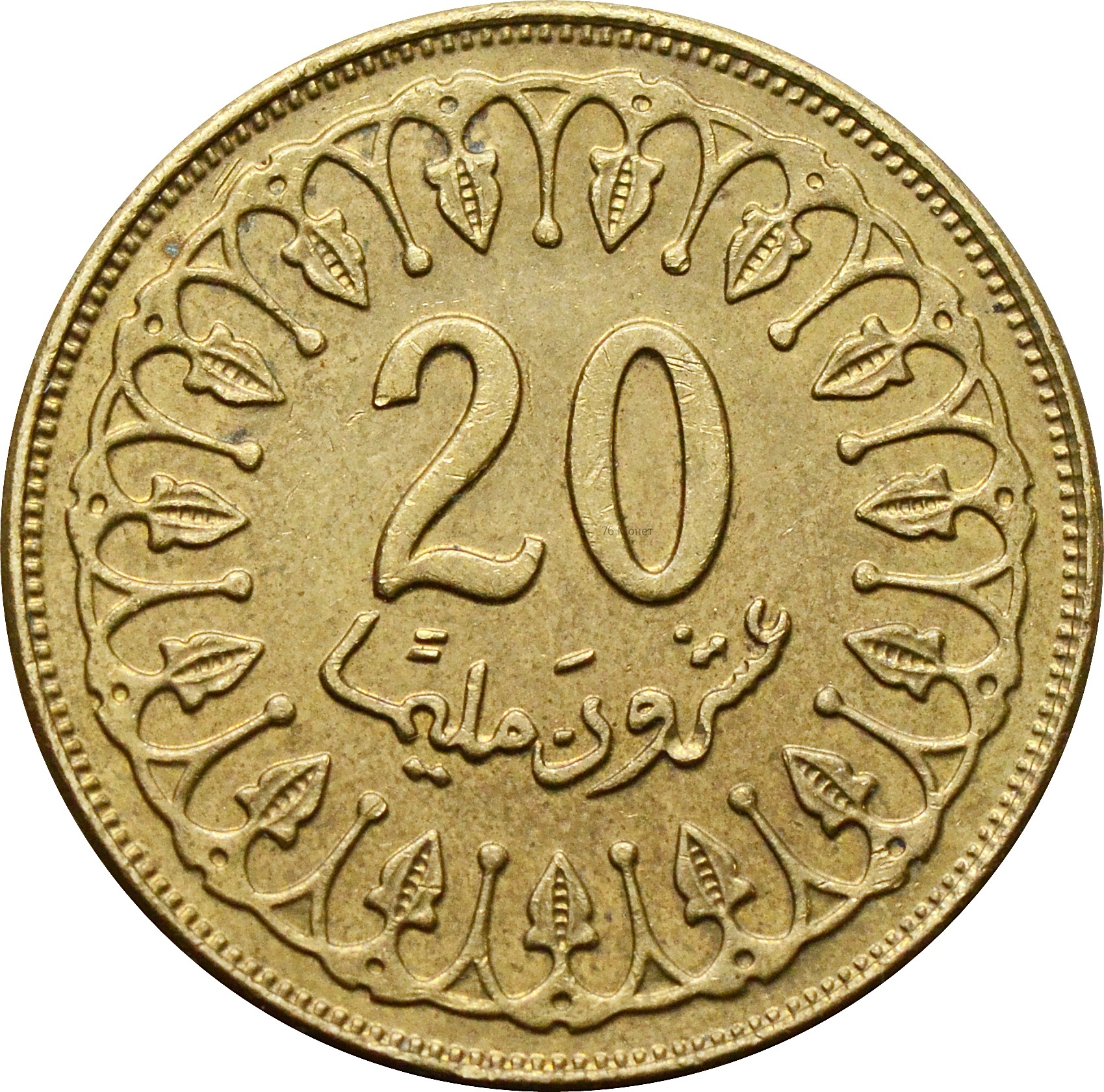 Монета 20 миллимов 2007-2017 (случайный год) Тунис в состоянии XF.