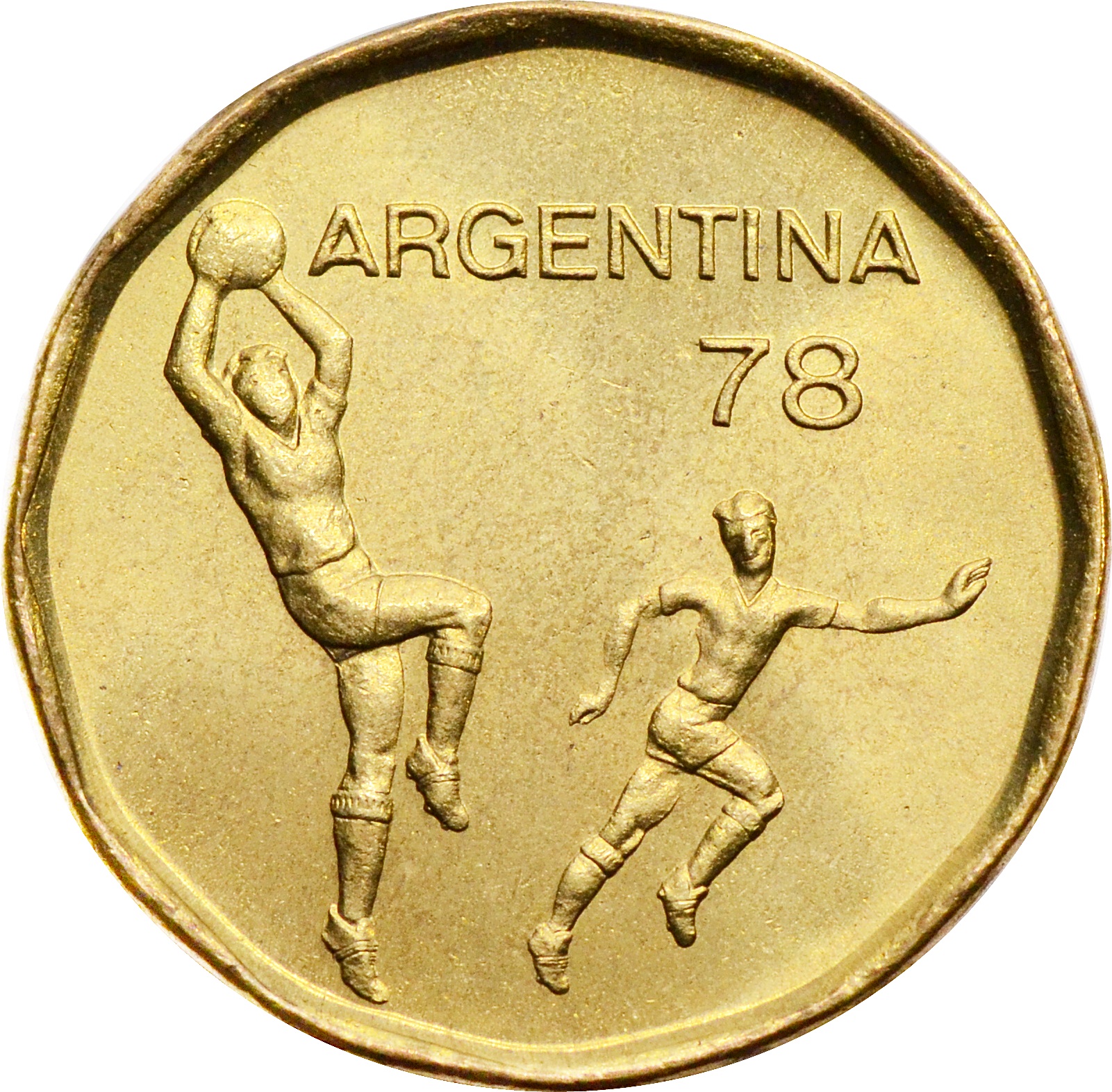 Аверс: в центре монеты изображены вратарь ловящий мяч и игрок. Над ними надпись: "ARGENTINA 78".