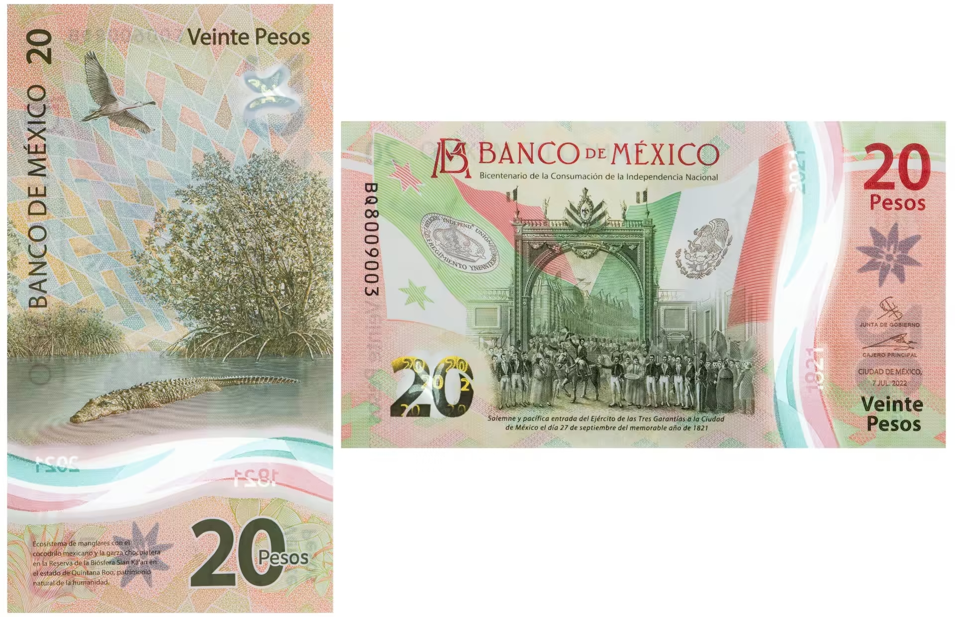 Лицевая сторона: в центре изображение с картины «Торжественное вступление Армии трёх гарантий в Мехико». В правой верхней части купюры — флаг Мексики, в левой верхней — флаг Армии трёх гарантий. Вверху указано название банка-эмитента банкноты.