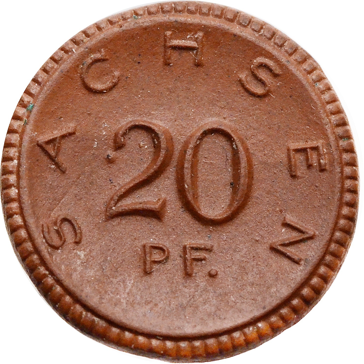 Аверс: по центру монеты номинал - цифра "20 PF.". Вдоль канта надпись: "SACHSEN".