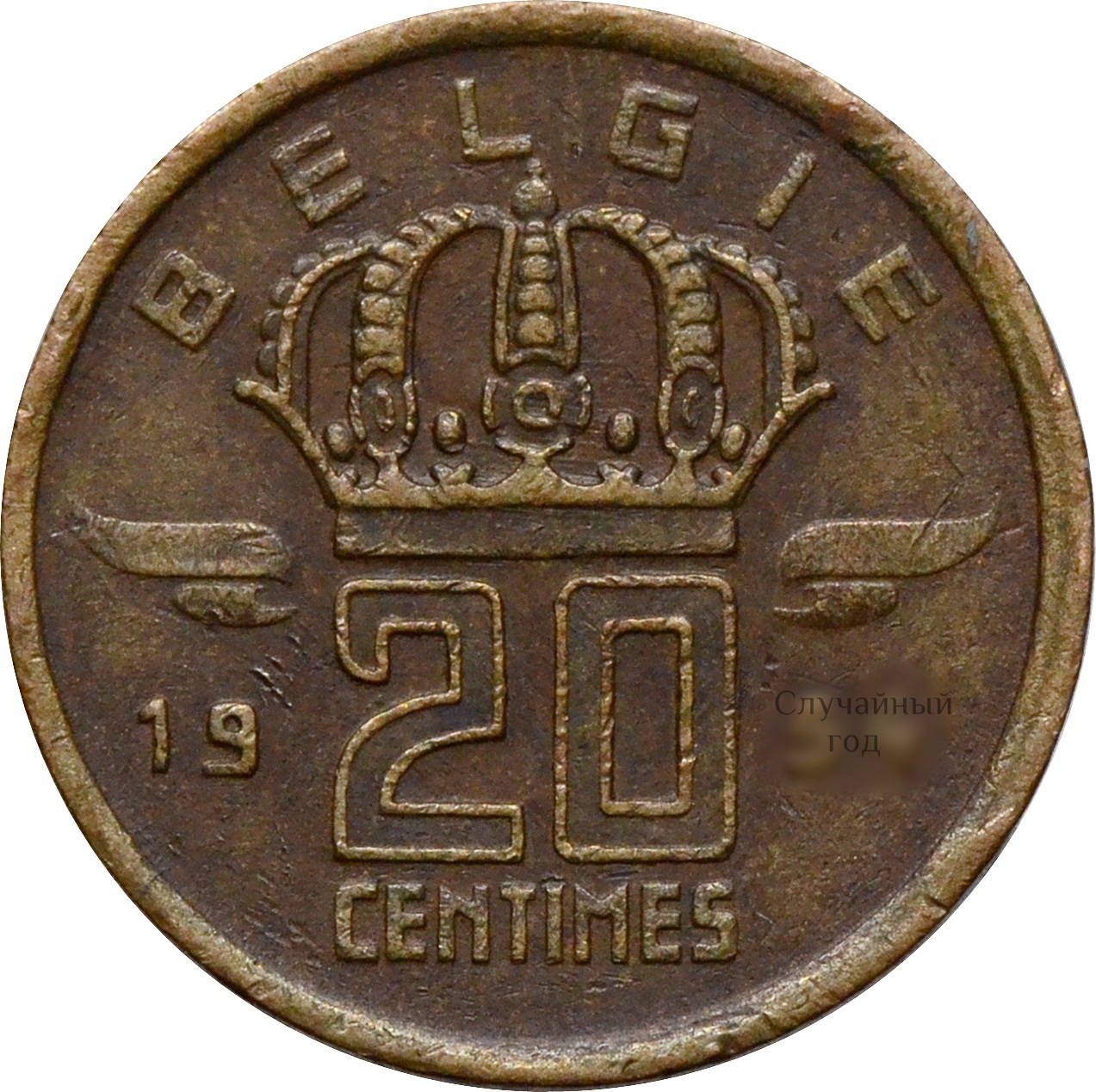 Реверс: прямо по центру монеты указан номинал в две строки: "20 CENTIMES", разделяющий год чеканки на две части. Над номиналом королевская корона Бельгии. Вдоль канта сверху надпись: "BELGIE".
