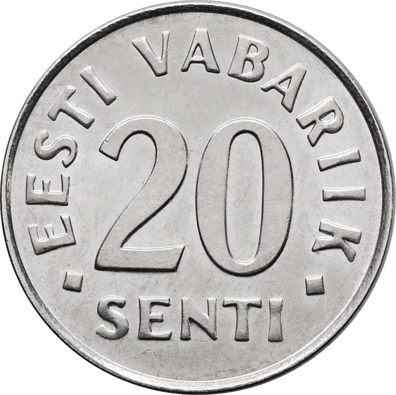 Реверс: в центре монеты указан номинал в две строки: "20 SENTI". Сверху, полукругом, надпись: "EESTI VABARIIK".
