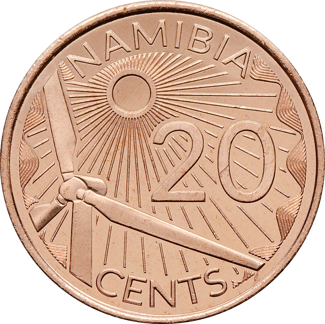 Реверс: в центре изображен ветряк и солнце, под ней указан номинал: "20 C". Сверху наименование страны: "NAMIBIA".