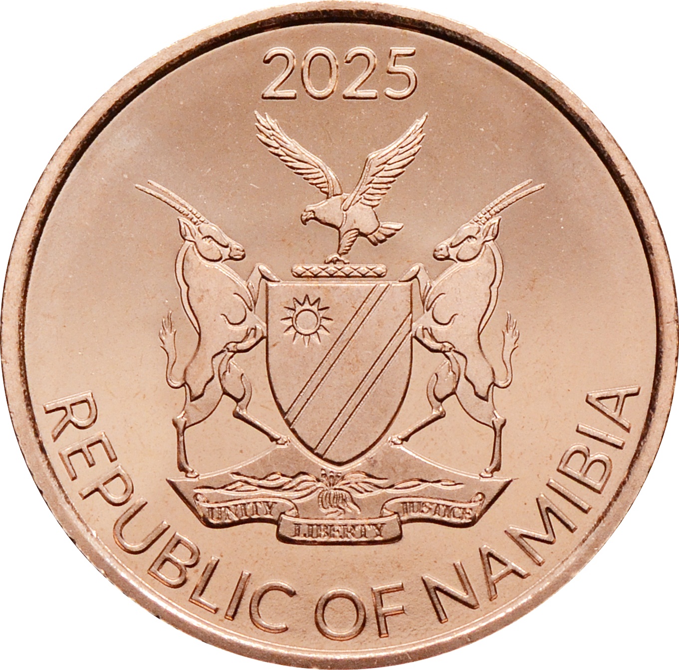 Аверс: по центру монеты расположен герб Намибии, ниже, вдоль канта, надпись: "REPUBLIC OF NAMIBIA". Сверху год чеканки: "2025".