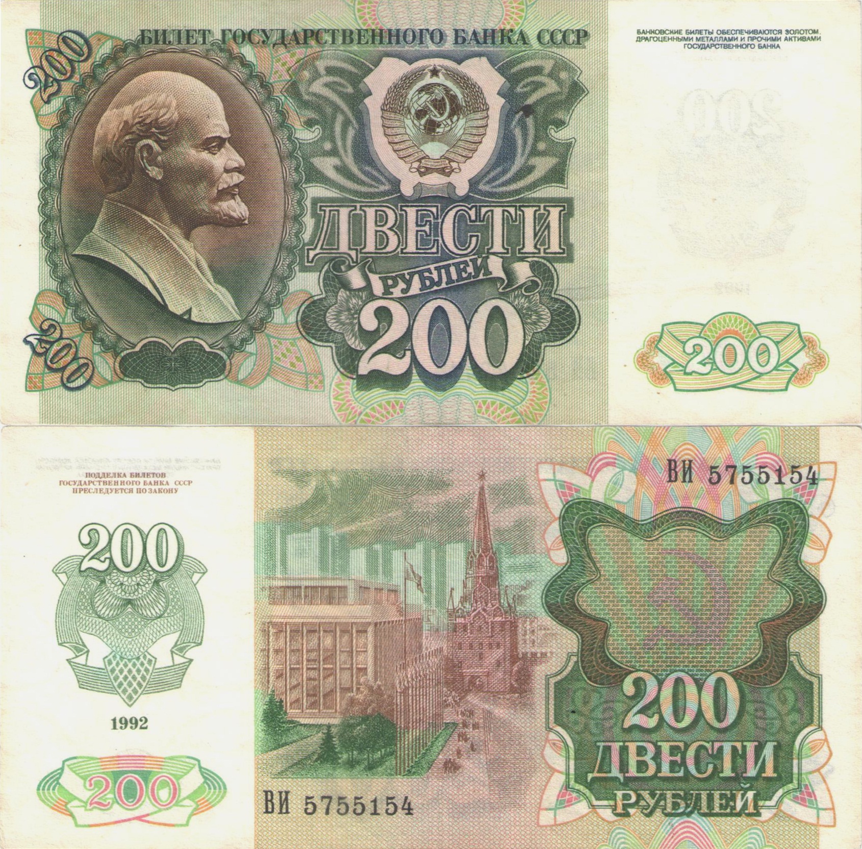 Оборотная сторона: слева имеется белое поле, снизу указано число номинала: "200". Над ним находится сложный элемент с узором и числом "200", а также год печати банкноты: "1992". Сверху надпись мелким шрифтом в три строки: "ПОДДЕЛКА БИЛЕТОВ ГОСУДАРСТВЕННОГО БАНКА СССР ПРЕСЛЕДУЕТСЯ ПО ЗАКОНУ". Остальное пространство банкноты заполнено фоном, меняющим к центру цвет от бежевого к светло-серому. По центру боны находится гравюра с изображением Кремлёвского Дворца Съездов и Троицкой башни Московского Кремля. С правой стороны вверху располагается рамка из волнистых линий с серпом и молотом на фоне лучей солнца внутри, ниже поверх фигурного элемента указан номинал цифрой - "200" и прописью - "ДВЕСТИ РУБЛЕЙ". Над рамкой находится серия и номер банкноты, которые продублированы в нижней части банкноты, под гравюрой с Кремлевским Дворцом.