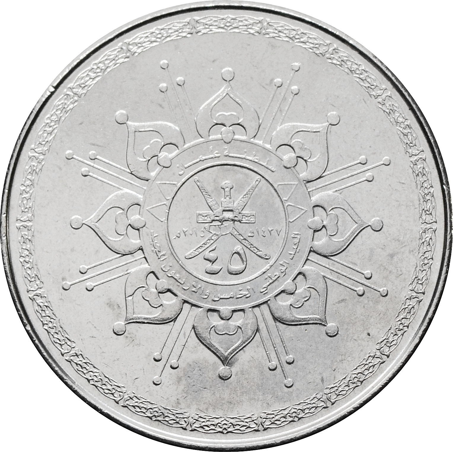 Аверс: по центру маленький герб Султаната Оман. По кругу идёт арабский стилизованный узор, изображающий солнце.