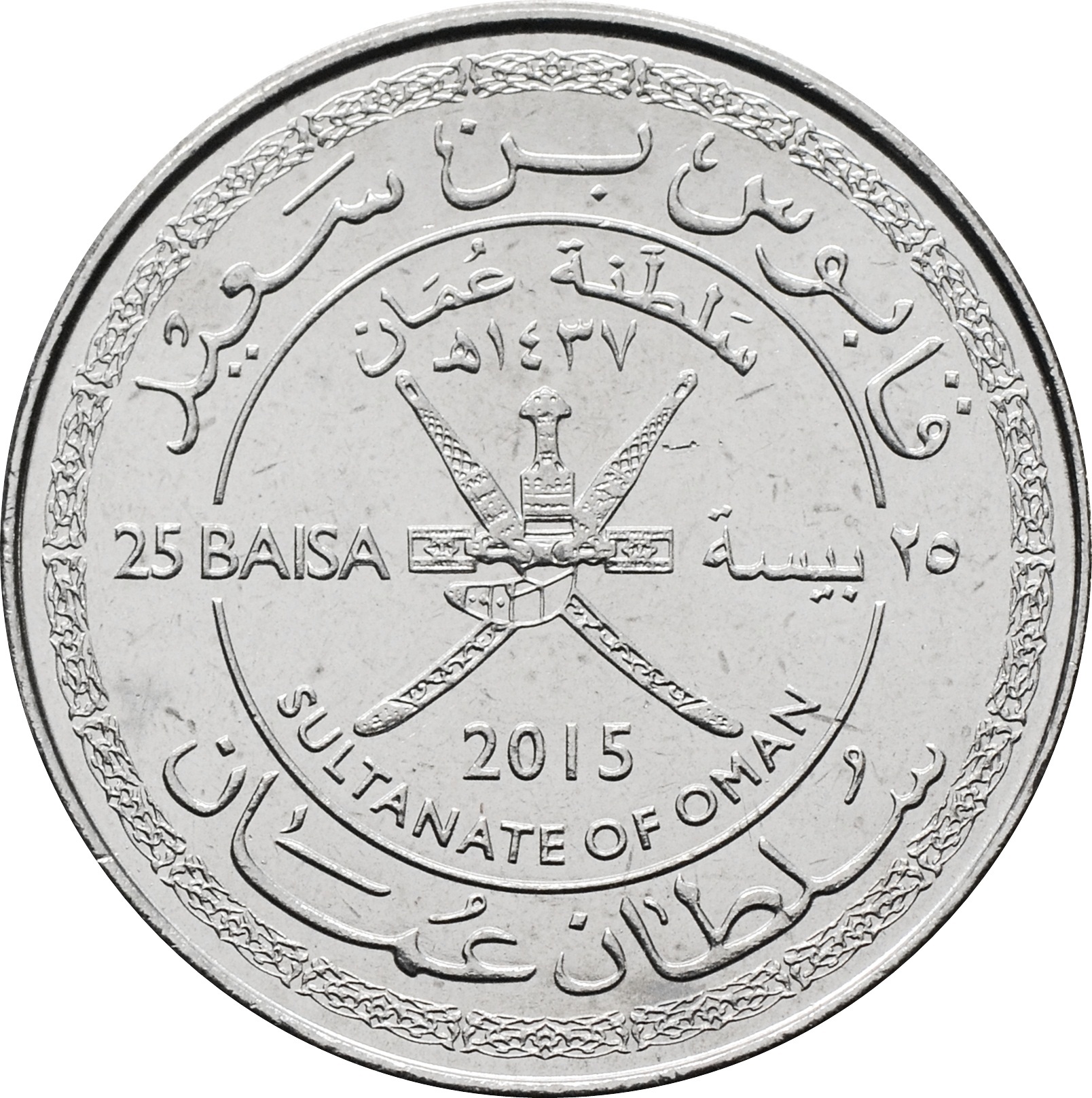 Реверс: в центре монеты изображен герб Омана состоящий из двух скрещённых сабель в ножнах (клинками вниз), и наложенным на них ханджаром в ножнах, с деталями ремней. Слева от центра указан номинал: "25 BAISA", справа он же на арабском. Снизу год чеканки: "2015"и надпись: "SULTANATE OF OMAN". Так же вдоль канта текст: "سلطان عمان / سلطنة عمان / قابوس بن سعيد".