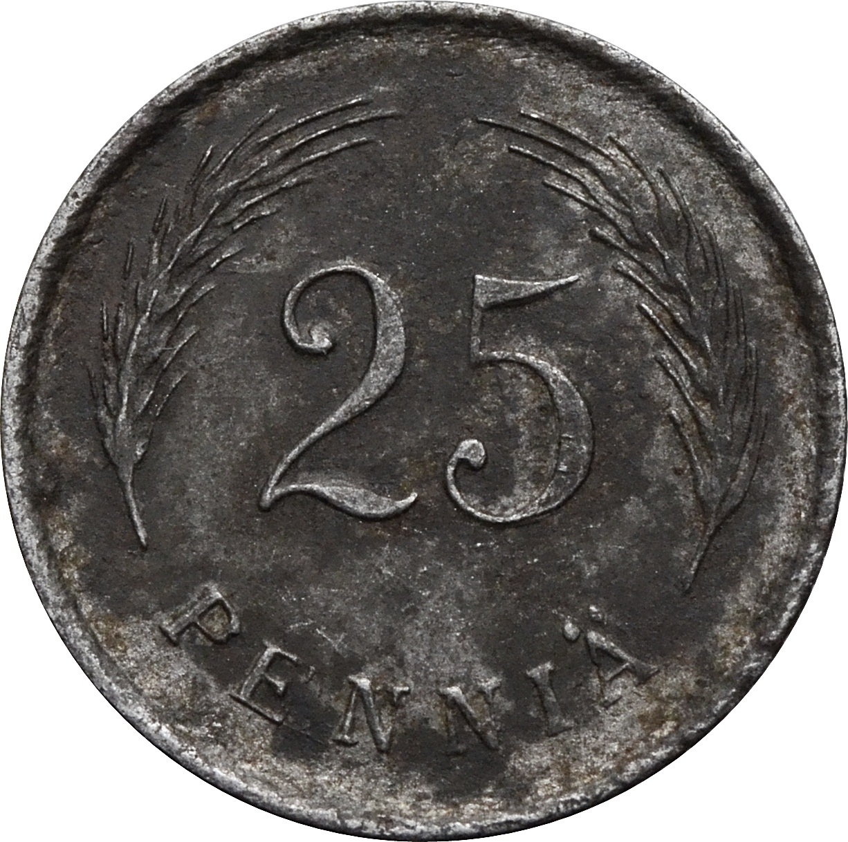 Реверс: по центру указан номинал монеты: "25 PENNIA", справа и слева венок из колосьев пшеницы.