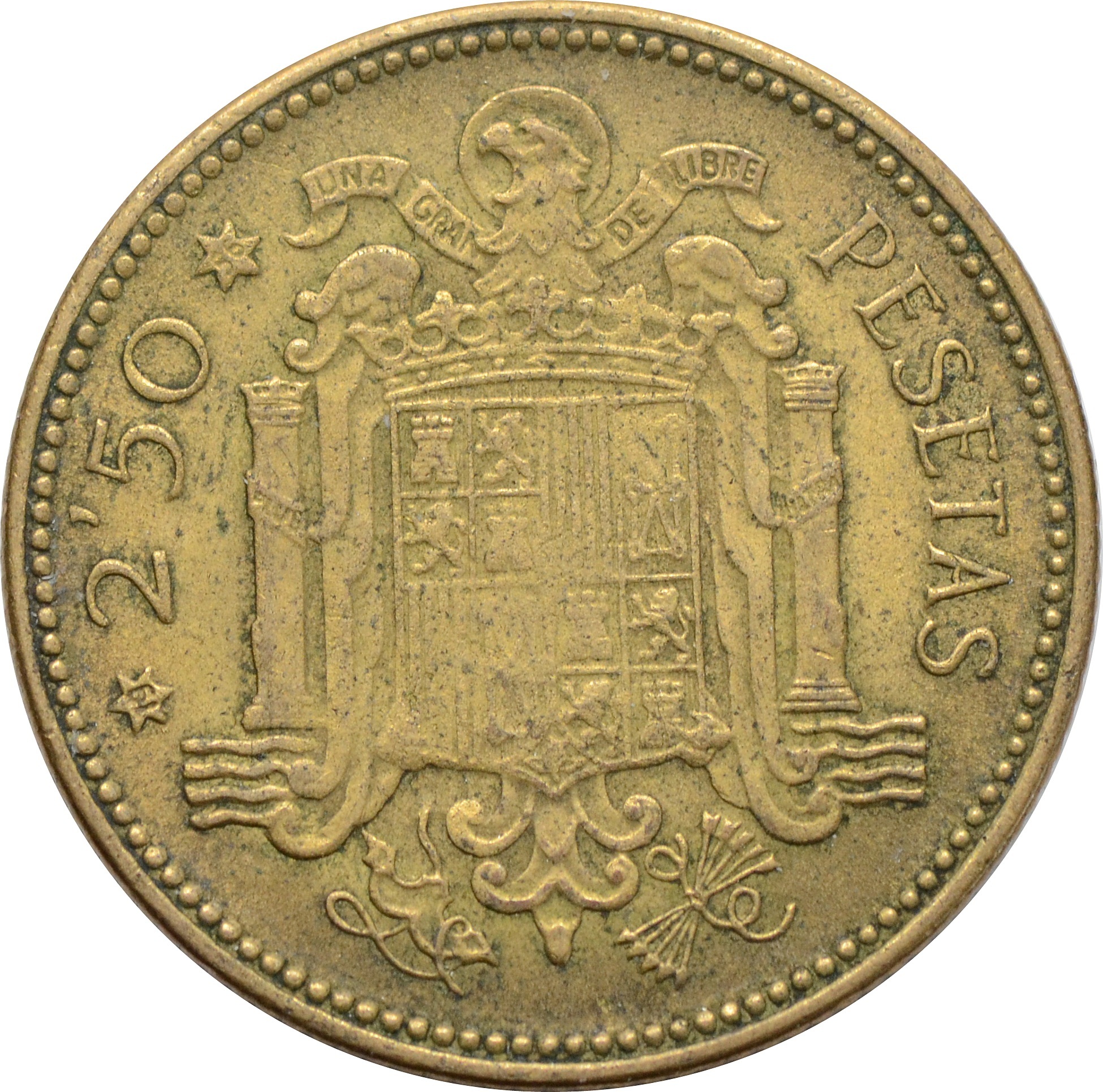 Реверс: По центру монеты герб Испании времен генерала Франко. Герб разделяет номинал на две части: слева - "2,5", а справа -" PESETAS".