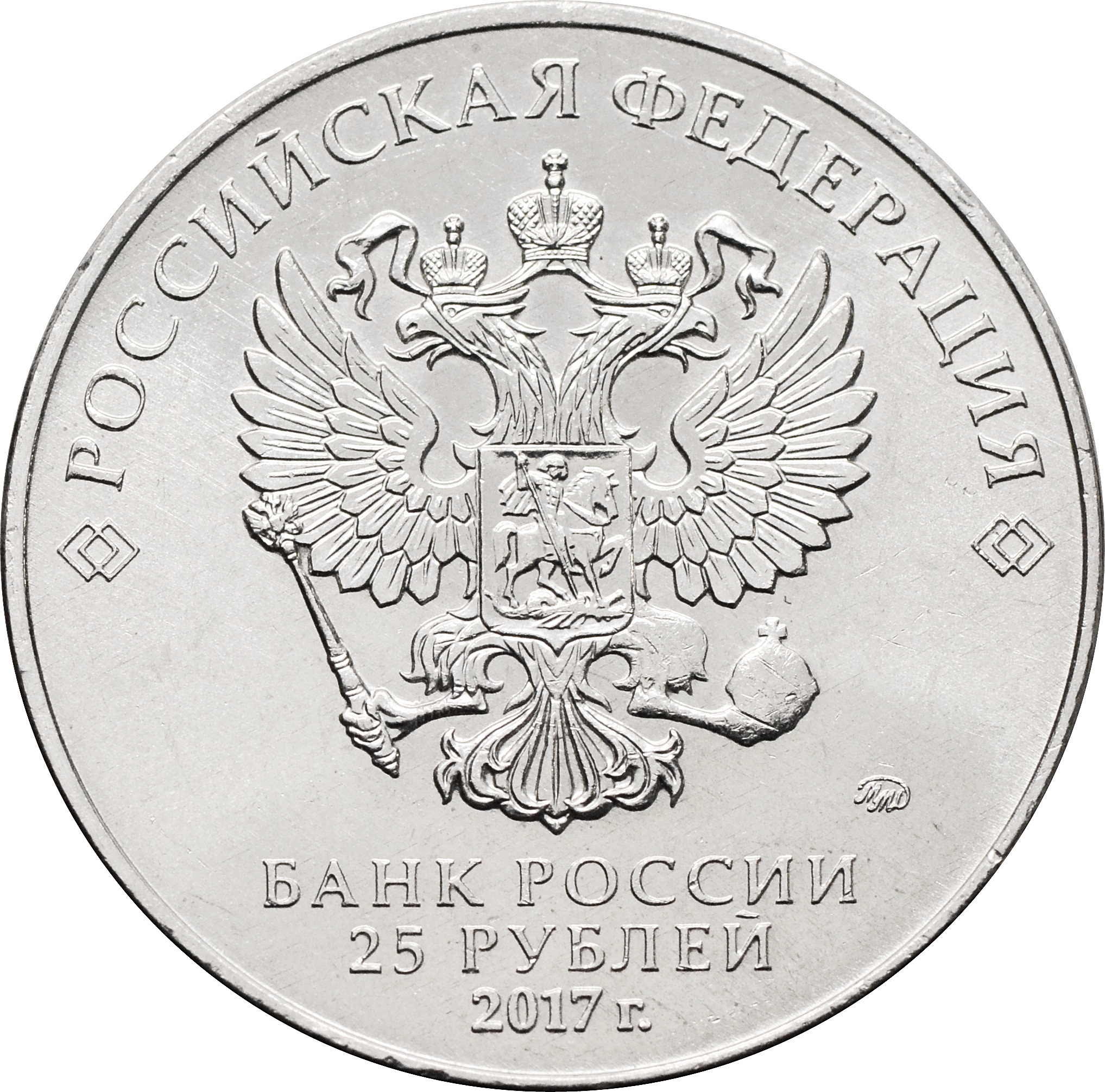 Аверс: в центре монеты размещен государственный герб РФ. Над ним, вдоль канта, надпись полукругом: "РОССИЙСКАЯ ФЕДЕРАЦИЯ", обрамленная с обеих сторон сдвоенными ромбами. Справа размещен товарный знак монетного двора. Снизу, под гербом надпись: "БАНК РОССИИ", ниже указан номинал и год чеканки: "25 РУБЛЕЙ 2017 г.".