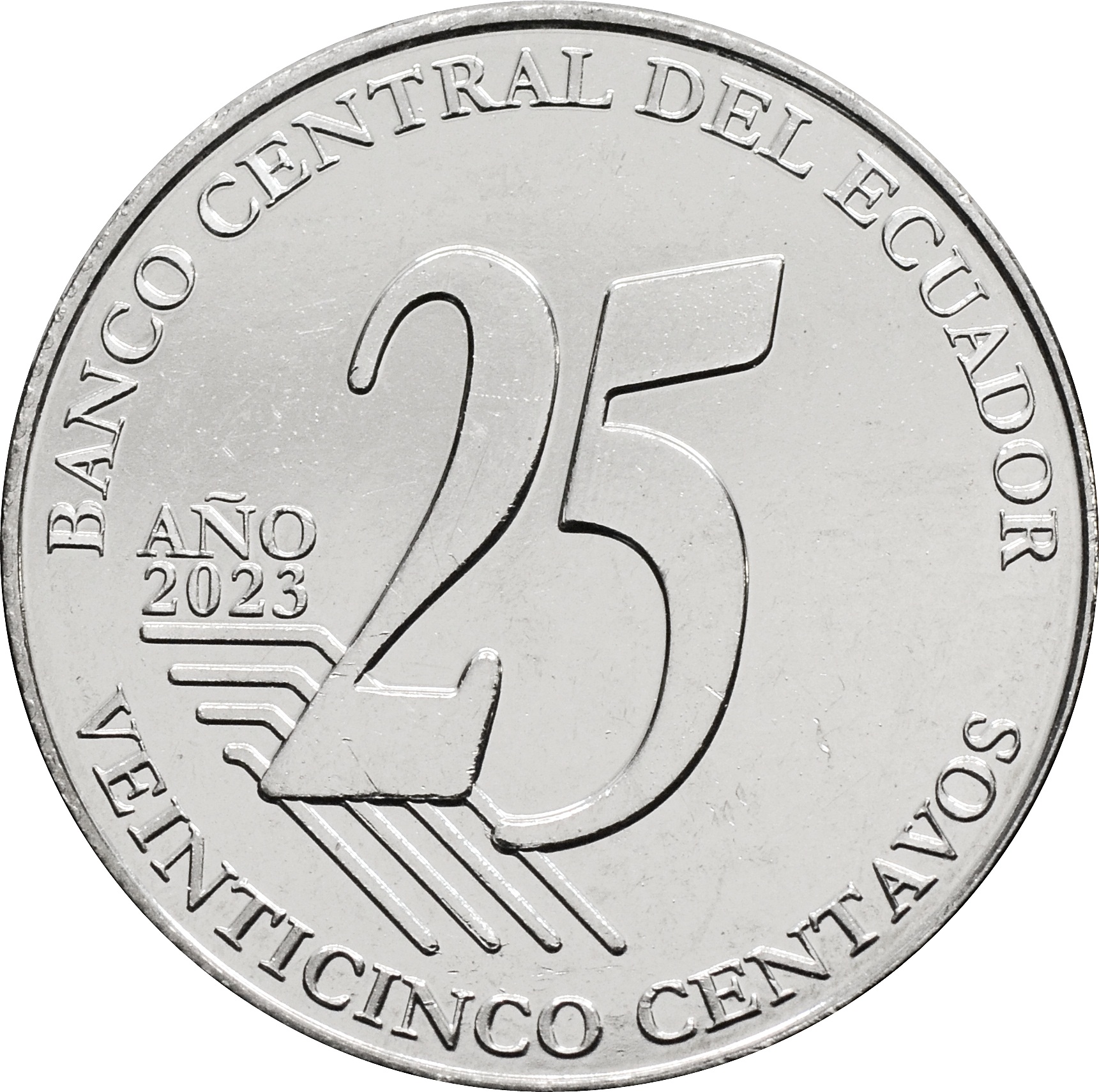 Реверс: по центру монеты указан номинал большой цифрой - "25". Вдоль нижнего края монеты надпись: "VEINTICINCO CENTAVOS", слева надпись поверх стилизованного флага: "AÑO 2023". Вверху расположен текст: "BANCO CENTRAL DEL ECUADOR".