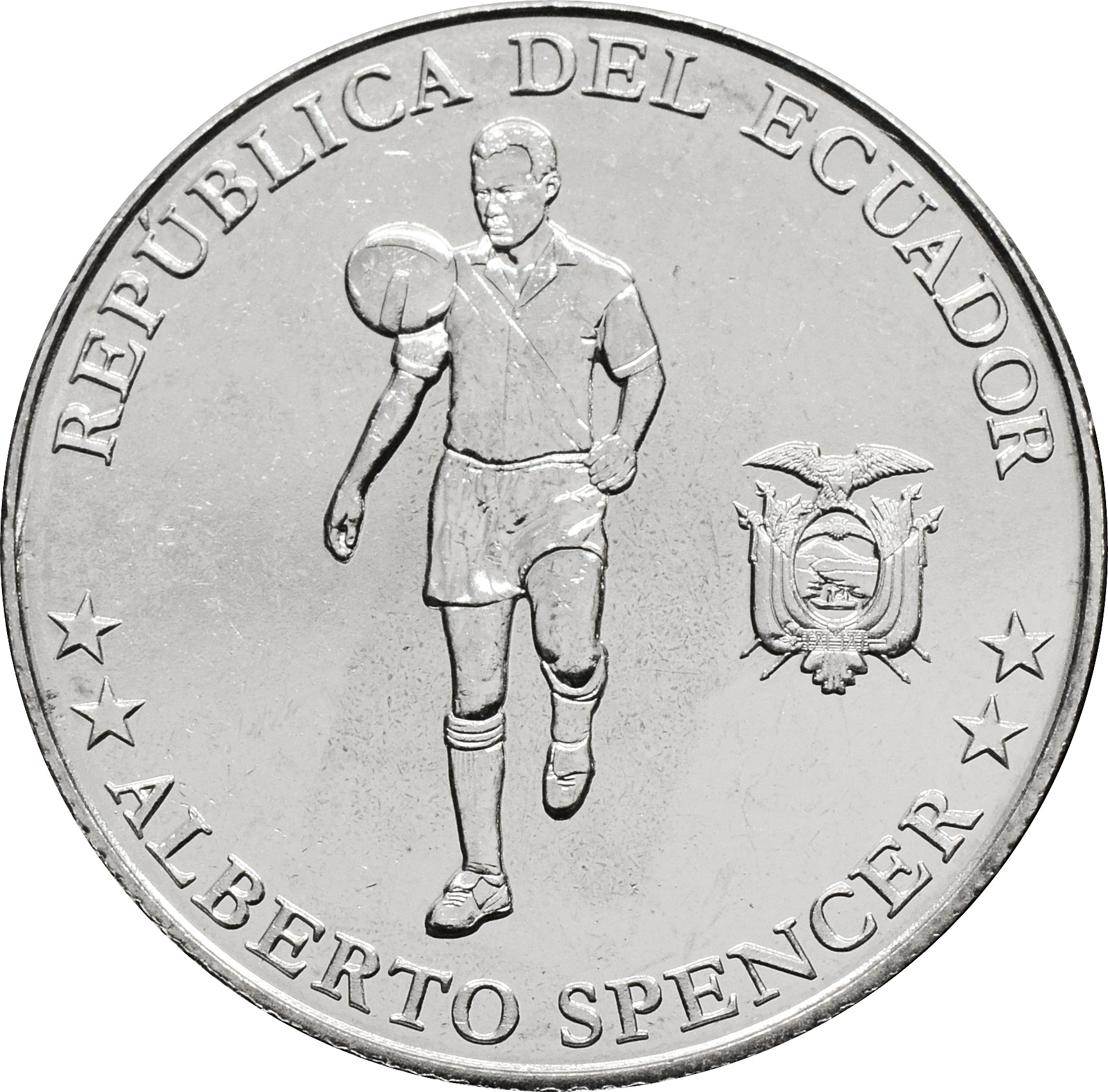 Аверс: в центре монеты портрет Альберто Спенсера. Вдоль края монеты надписи: внизу - "**JALBERTO SPENCER**", а вверху - "RUPUBLICA DEL ECUADOR".