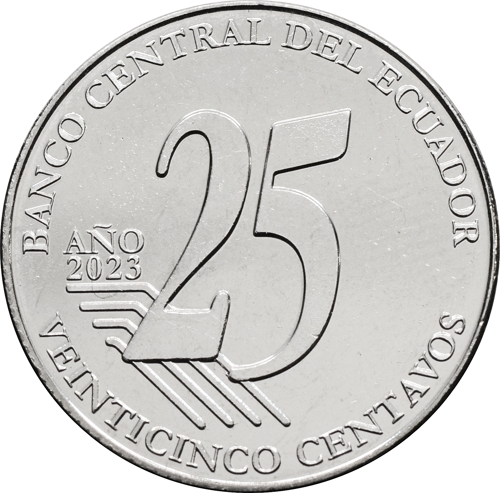 Реверс: по центру монеты указан номинал большой цифрой - "25". Вдоль нижнего края монеты надпись: "VEINTICINCO CENTAVOS", слева надпись поверх стилизованного флага: "AÑO 2023". Вверху расположен текст: "BANCO CENTRAL DEL ECUADOR".
