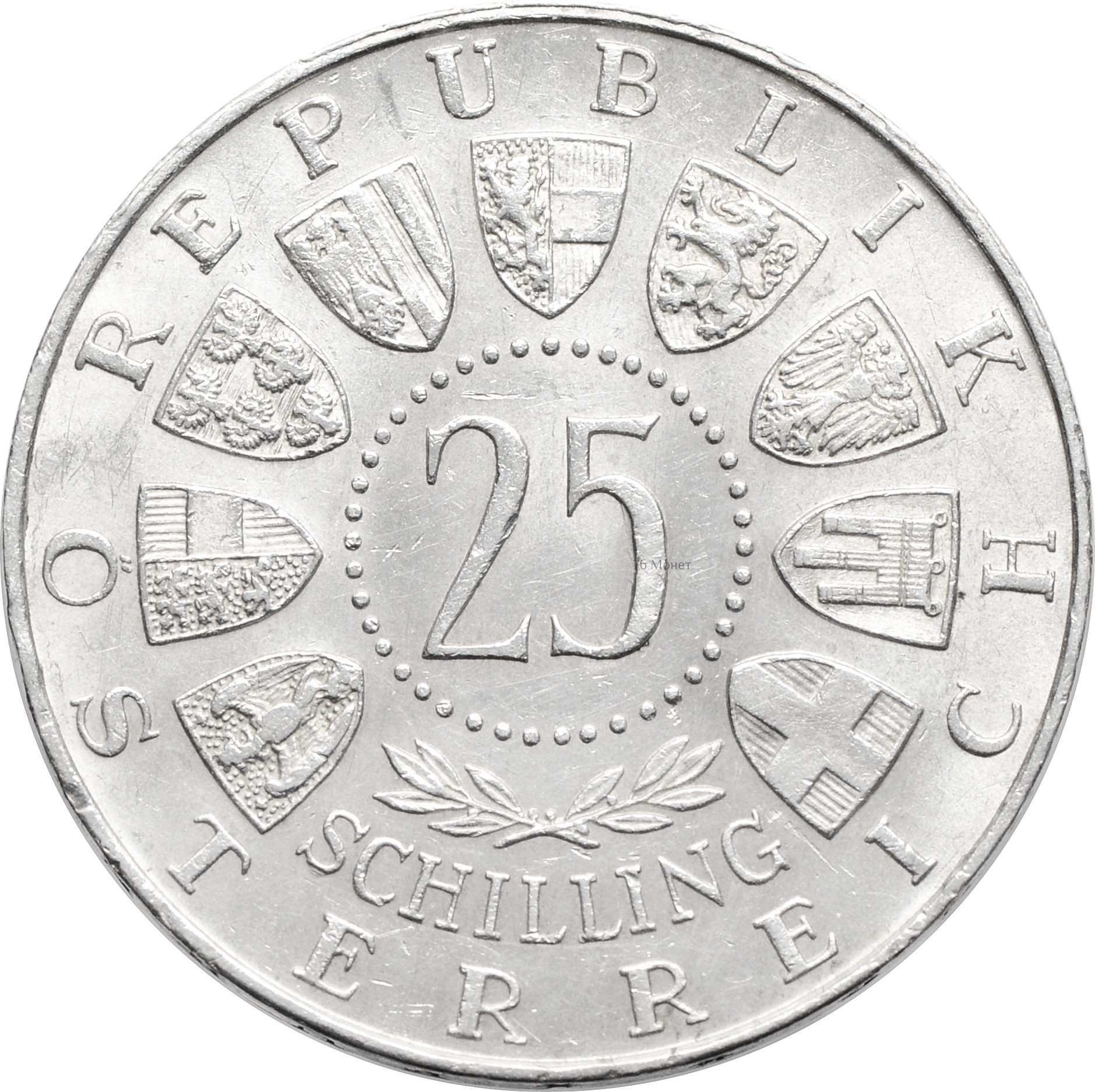 Аверс: по центру монеты изображены гербы. По краю монеты надписи: вверху - "REPUBLIK", а внизу - "ÖSTERREICH". В самом центре указан номинал: "25 SCHILLING".