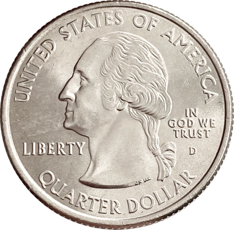 Аверс: в центре изображение портрета Джорджа Вашингтона - 1-ого президента США. Вдоль канта монеты надписи: сверху - "UNITED STATES OF AMERICA", снизу – "QUARTER DOLLAR", слева – "LIBERTY", справа – "IN GOD WE TRUST", а так же знак монетного двора - "D".