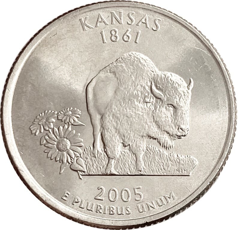 Реверс: в центре монеты изображение американского бизона, пасущегося на поле, а слева от него расположены цветы подсолнуха. Вдоль канта монеты надписи: сверху - "KANSAS 1788", снизу - год чеканки "2005" и "E PLURIBUS UNUM".