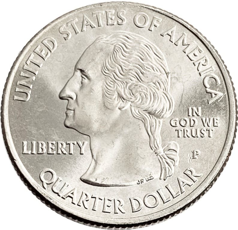 Аверс: в центре изображение портрета Джорджа Вашингтона - 1-ого президента США. Вдоль канта монеты надписи: сверху - "UNITED STATES OF AMERICA", снизу – "QUARTER DOLLAR", слева – "LIBERTY", справа – "IN GOD WE TRUST", а так же знак монетного двора - "P".