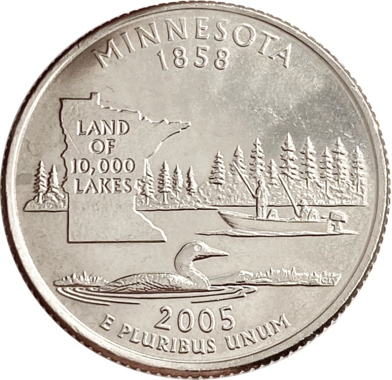 Реверс: в центре монеты изображена красота Миннесоты. На фоне озера, левее, представлена рельефная карта контуров штата с надписью: "LAND OF 10,000 LAKES", а правое моторная лодка с рыбаками на борту. Вдоль канта монеты надписи: сверху - "MINNESOTA 1788", снизу - год чеканки "2005" и "E PLURIBUS UNUM".