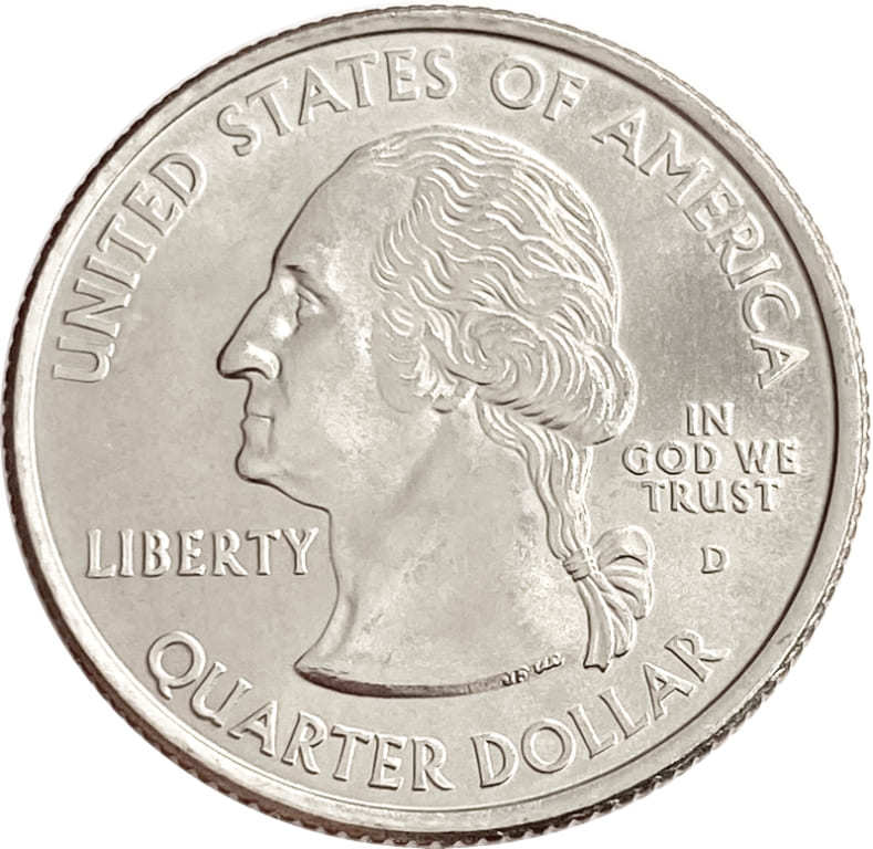 Аверс: в центре изображение портрета Джорджа Вашингтона - 1-ого президента США. Вдоль канта монеты надписи: сверху - "UNITED STATES OF AMERICA", снизу – "QUARTER DOLLAR", слева – "LIBERTY", справа – "IN GOD WE TRUST", а так же знак монетного двора - "D".