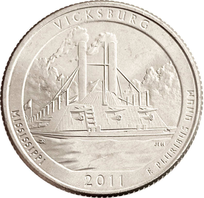 Реверс: в центре монеты, представлено изображение канонерской бронированной лодки U.S.S. Cairo, сплавляющейся на пару вниз по реке Язу. Вдоль канта монеты, полукругом, расположены надписи: сверху - "VICKSBURG", снизу - "MISSISSIPPI 2011 E PLURIBUS UNUM".