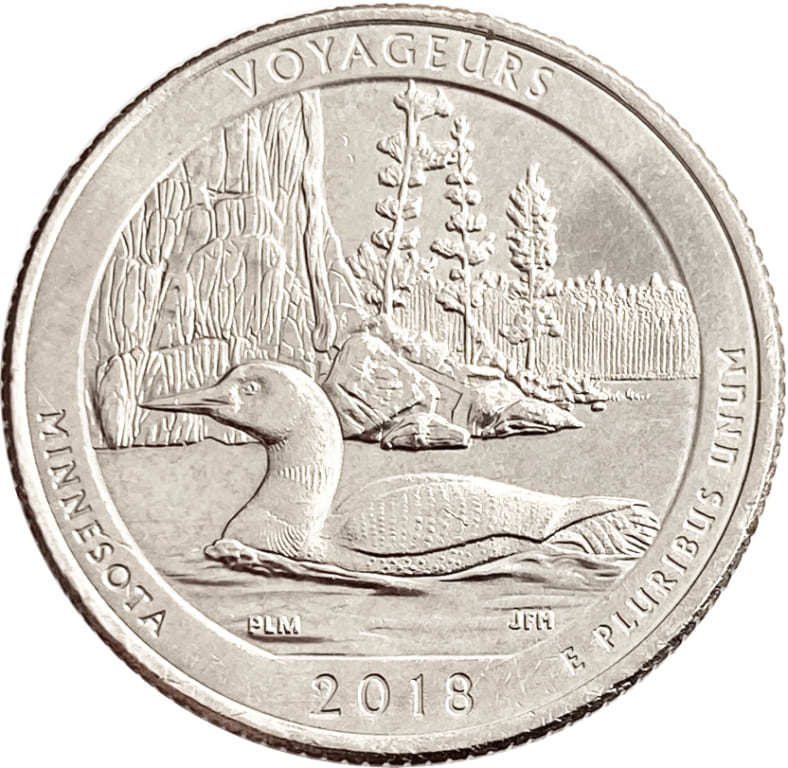 Реверс: в центре монеты изображена плывущая гагара на фоне гор и соснового леса. Вдоль канта монеты, полукругом, расположены надписи: сверху - "VOYAGEURS", снизу - "MINESOTA 2018 E PLURIBUS UNUM".