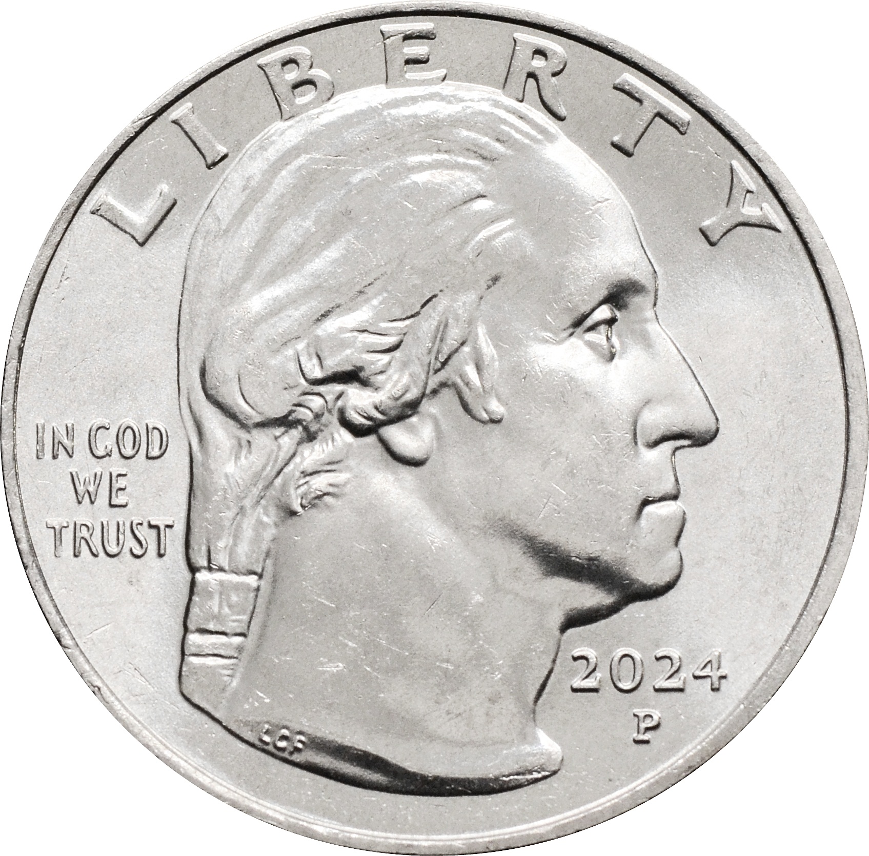 Аверс: в центре изображение портрета Джорджа Вашингтона - 1-ого президента США. Вдоль канта монеты сверху надпись: "LIBERTY", слева – "IN GOD WE TRUST". Справа знак монетного двора и год чеканки - "2024 P".