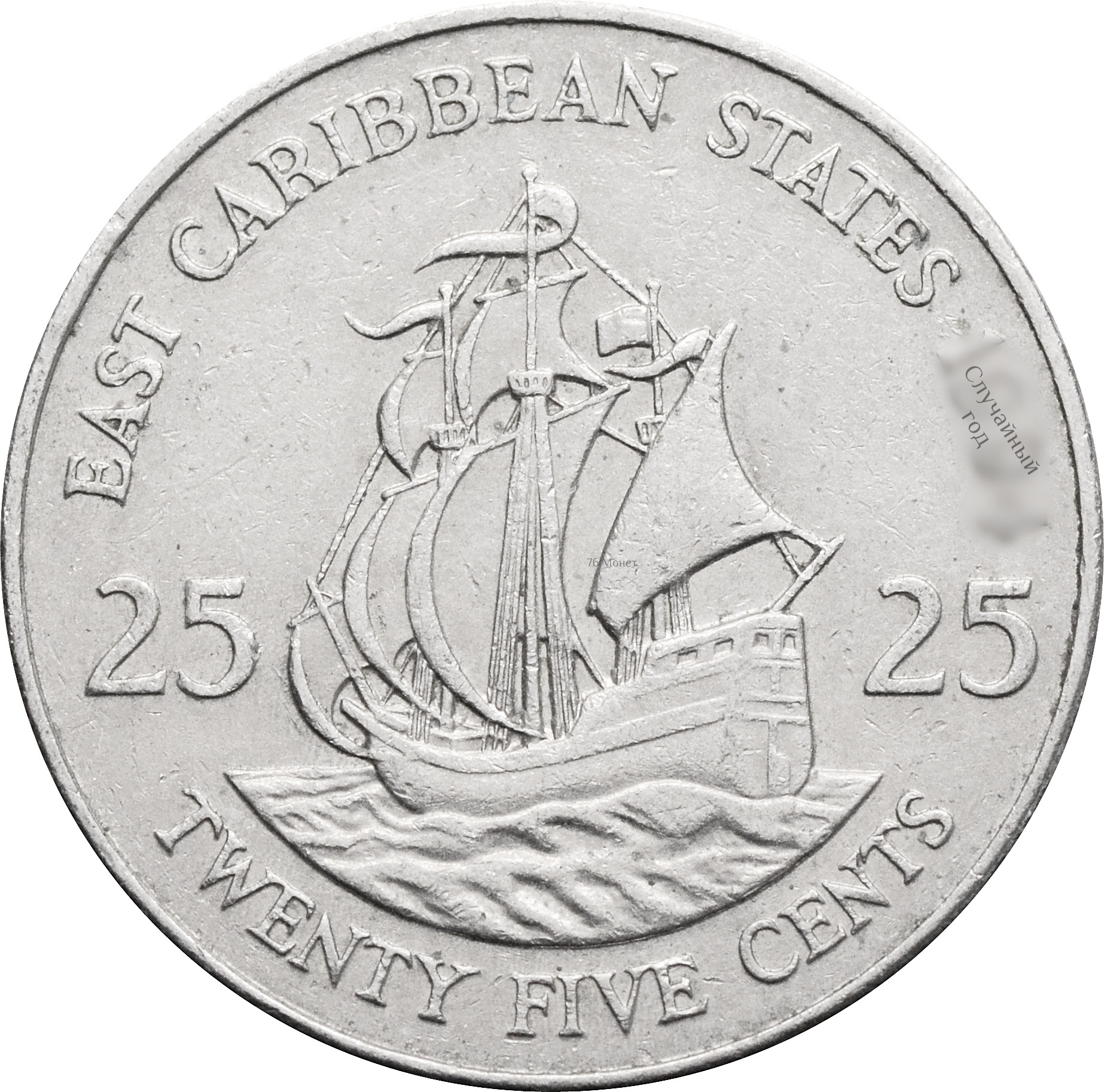 Монета 25 центов 1981-2000 (случайный год) Восточные Карибы в состоянии VF-XF.