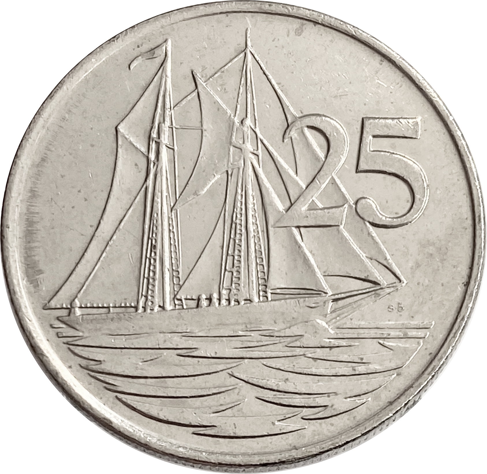 Реверс: в центре монеты изображен корабль, правее от него указан номинал - цифра "25" (25 центов).