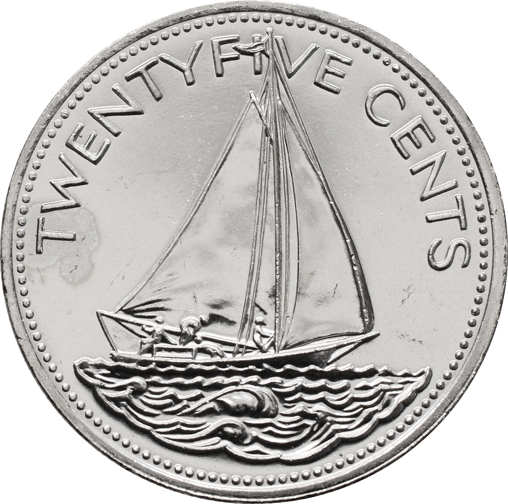 Реверс: по центру монеты изображен парусник рядом с островом. Сверху указан номинал: "25 CENTS".
