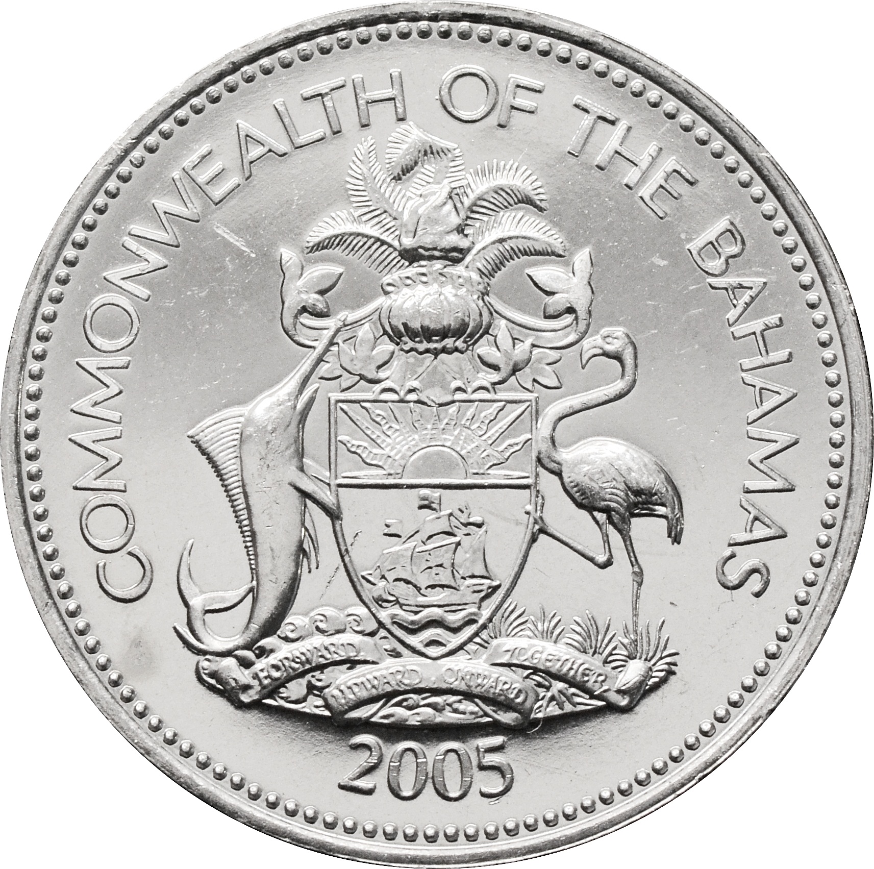 Аверс: в центре монеты изображение герба Багамских островов. Под ним указан год чеканки: "2005". Сверху, полукругом, располагается надпись: "COMMONWEALTH OF THE BAHAMAS".