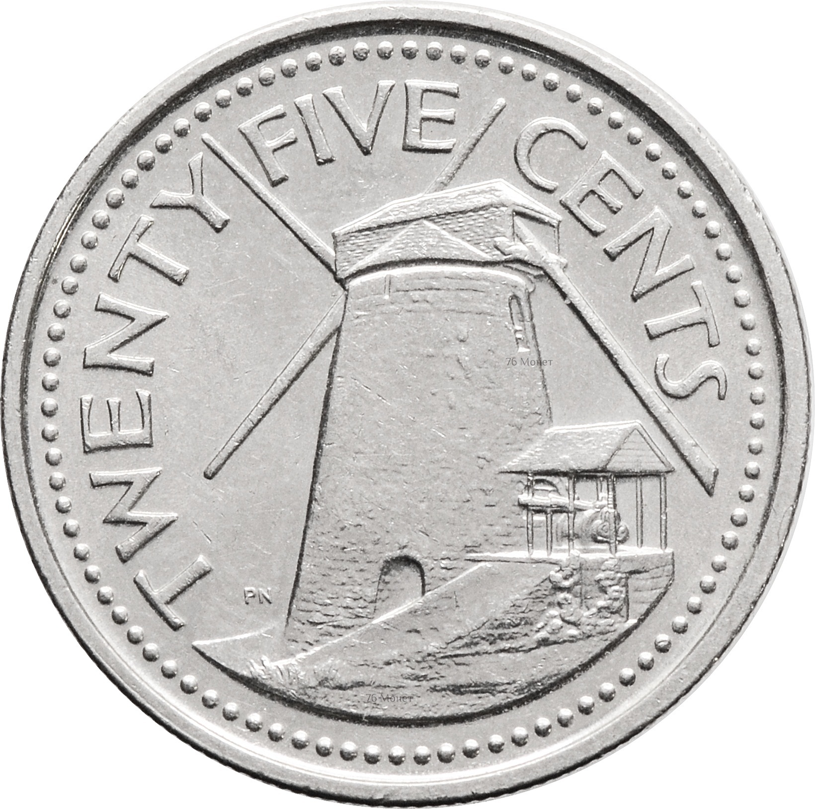 Реверс: по центру изображена мельница, над которой полукругом прописан номинал: "TWENTY FIVE CENTS".