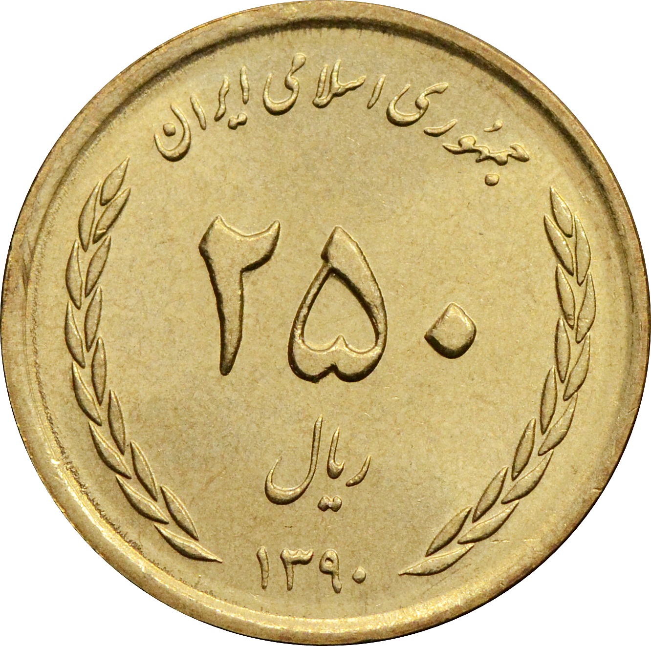 Реверс: в центре монеты указан номинал арабскими цифрами, снизу год чеканки по Хиджре. Над номиналом размещена надпись на персидском языке: "جمهوری اسلامی ايران". Слева и справа от номинала стилистический лавровый венок.