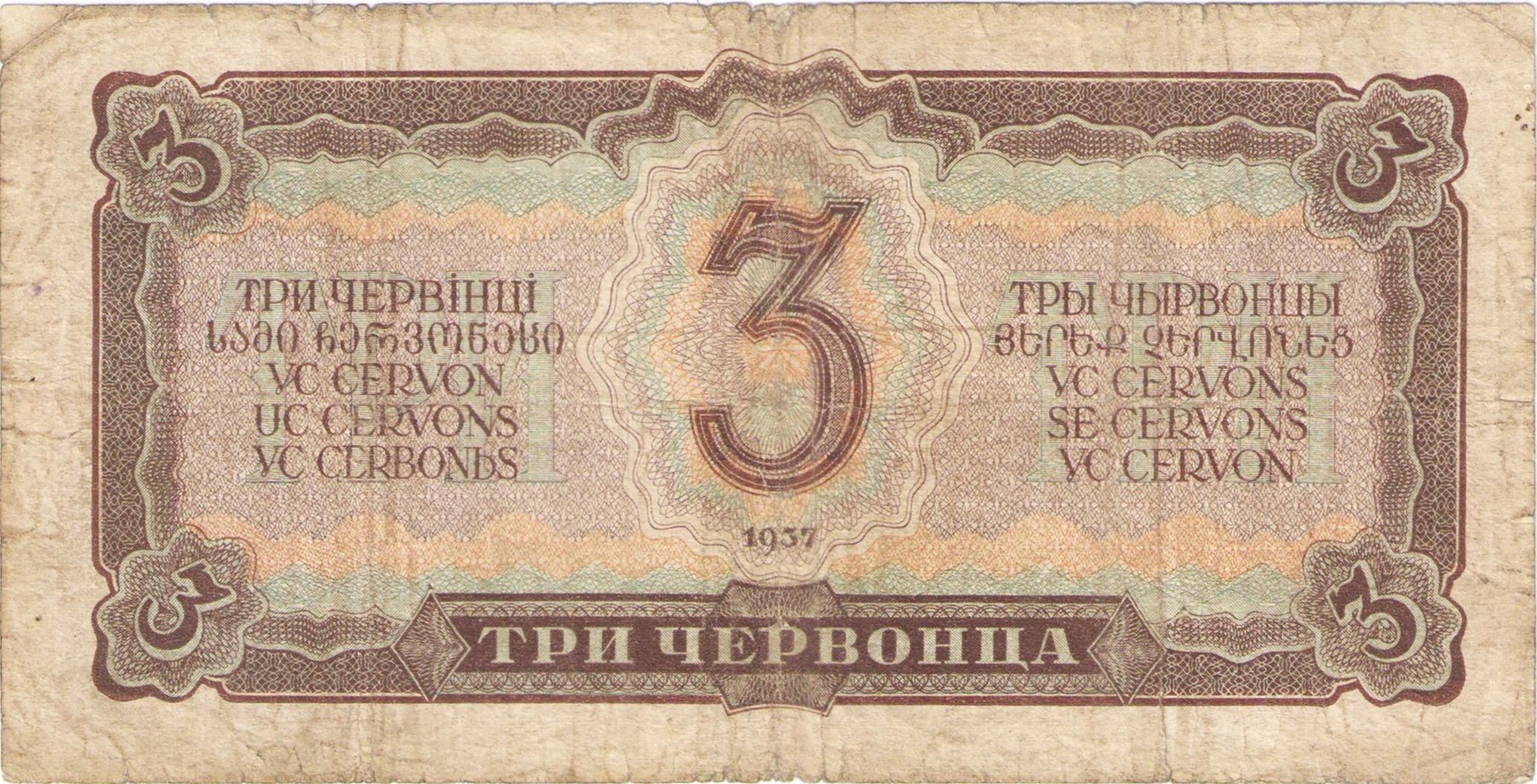 Оборотная сторона: по центру на цветном оформлении находится крупная розетка с цифрой "3" и датой "1937". В нижней части рамки указан номинал прописью: "ТРИ ЧЕРВОНЦА", по бокам гильоширные розетки с цифрами "3". Справа и слева от центра поверх волнистых линий номинал повторен на 10 других языках: украинском, белорусском, грузинском, армянском, Казахском, Узбекском, Туркменском, Таджикском, Киргизском и Азербайджанском. Все это заключено в прямоугольную зелёную рамку, состоящую из волнистых линий.