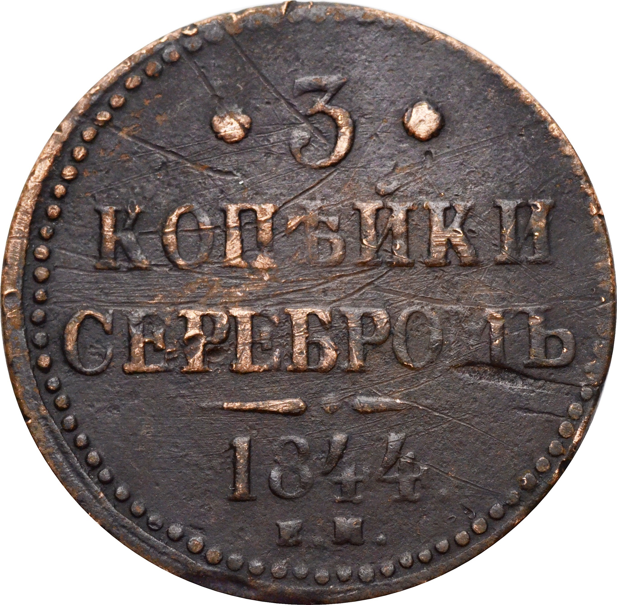 Реверс: по центру указан номинал в три строки: "3 КОПѢЙКИ СЕРЕБРОМЪ". Под надписью расположен декоративный разделитель в виде двух фигурных линий и небольшой точки между ними. Под разделителем указан год чеканки монеты: "1844" и обозначение монетного двора — буквы "Е.М.". По окружности канта имеются рельефные элементы, выполненные в виде точек.