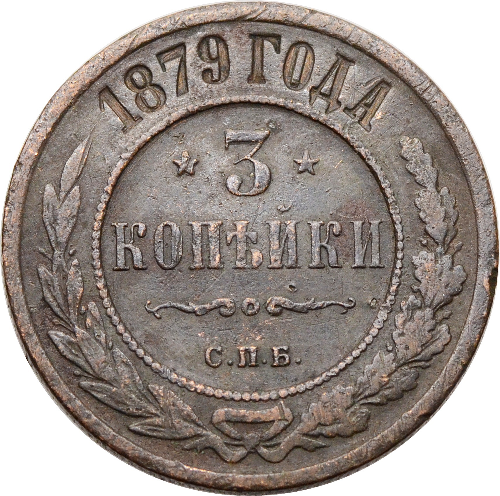 Реверс: в центре указан номинал: "3 КОПѢЙКИ". Под номиналом, расположен декоративный разделитель. Под разделителем можно увидеть обозначение монетного двора: "С.П.Б.". Центральная часть отделена от остального изображения, окружностью в виде точек. В верхней части полукругом, вдоль канта, расположен год чеканки: "1879 ГОДА". Ниже этой надписи, вдоль канта, изображен венок из лавровой и дубовой ветвей, которые, в нижней части, перевязаны лентой на узел бантом.