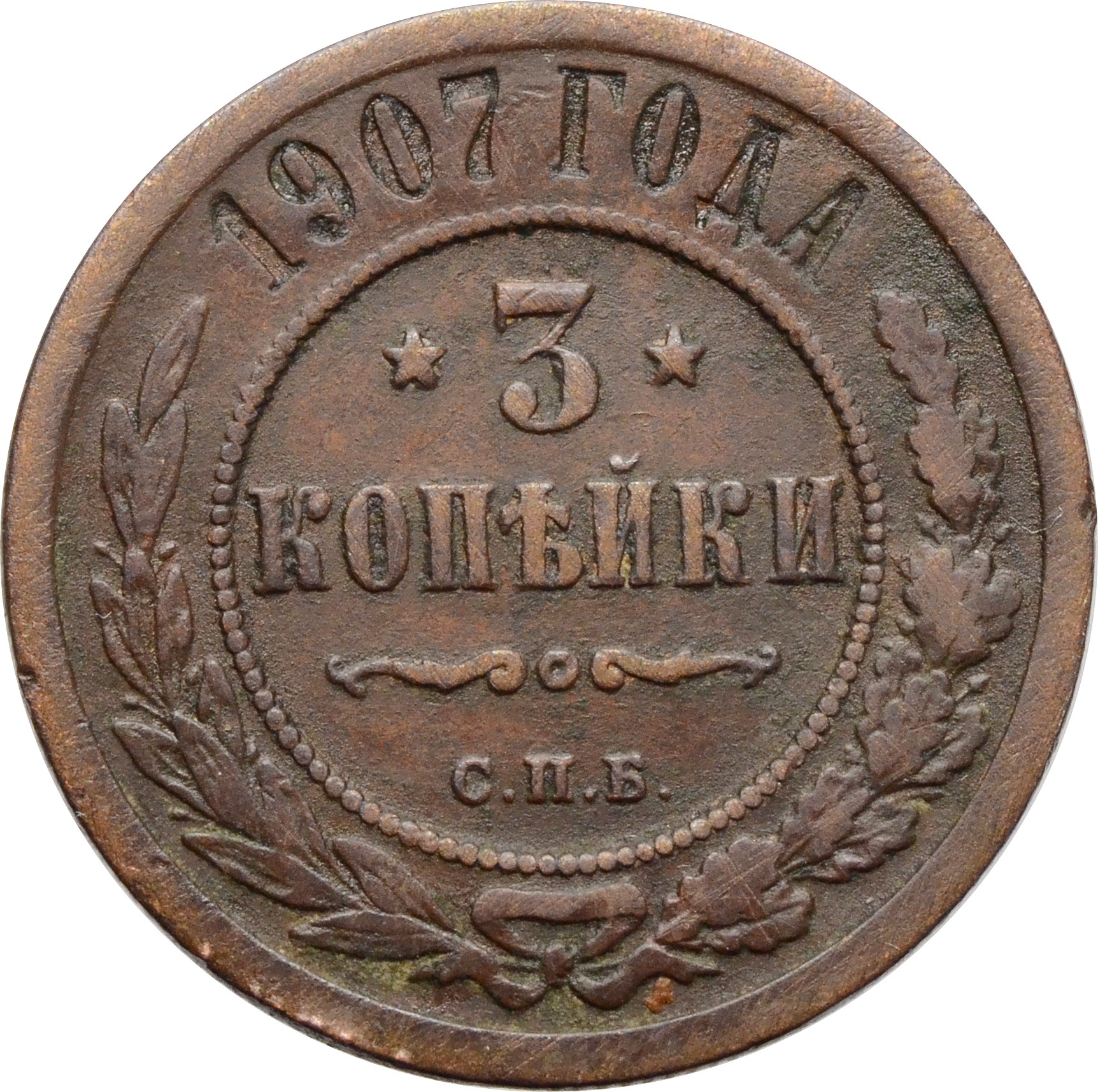 Реверс: в центре указан номинал: "3 КОПЕЙКИ". Под номиналом, расположен декоративный разделитель. Под разделителем можно увидеть обозначение монетного двора: "С.П.Б.". Центральная часть отделена от остального изображения, окружностью в виде точек. В верхней части полукругом, вдоль канта, расположен год чеканки: "1907 ГОДА". Ниже этой надписи, вдоль канта, изображен венок из лавровой и дубовой ветвей, которые, в нижней части, перевязаны лентой на узел бантом.