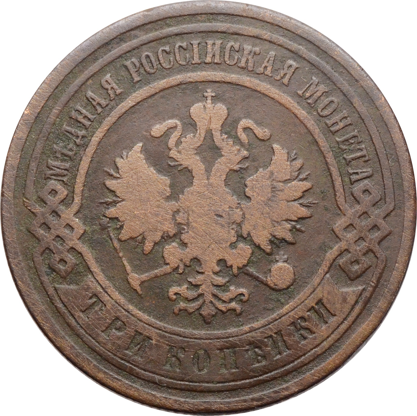 Аверс: центр аверса украшает малый герб Российской Империи - двуглавый орел, с коронами на головах, держащий скипетр в правой лапе и державу в левой. На его груди щит с изображением Георгия Победоносца с копьем поражающего змея, а на крыльях маленькие щиты с гербами царств: Казанского, Польского, Херсонеса Таврического, Астраханского, Сибирского, Грузинского и герб соединенных княжеств Киевского, Новгородского и Владимирского. Сверху, вдоль канта, надпись: "МЕДНАЯ РОССИЙСКАЯ МОНЕТА", снизу - номинал: "ТРИ КОПЕЙКИ"