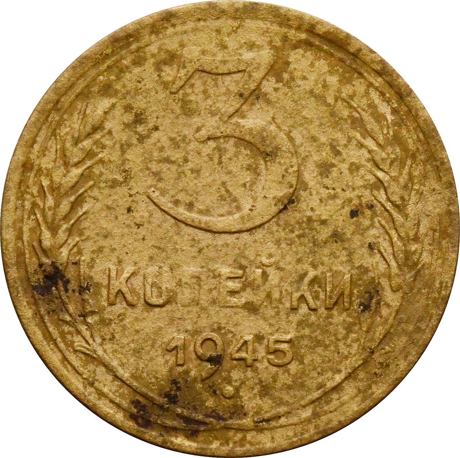 Монета 3 копейки 1945 года в состоянии VF (хорошее).