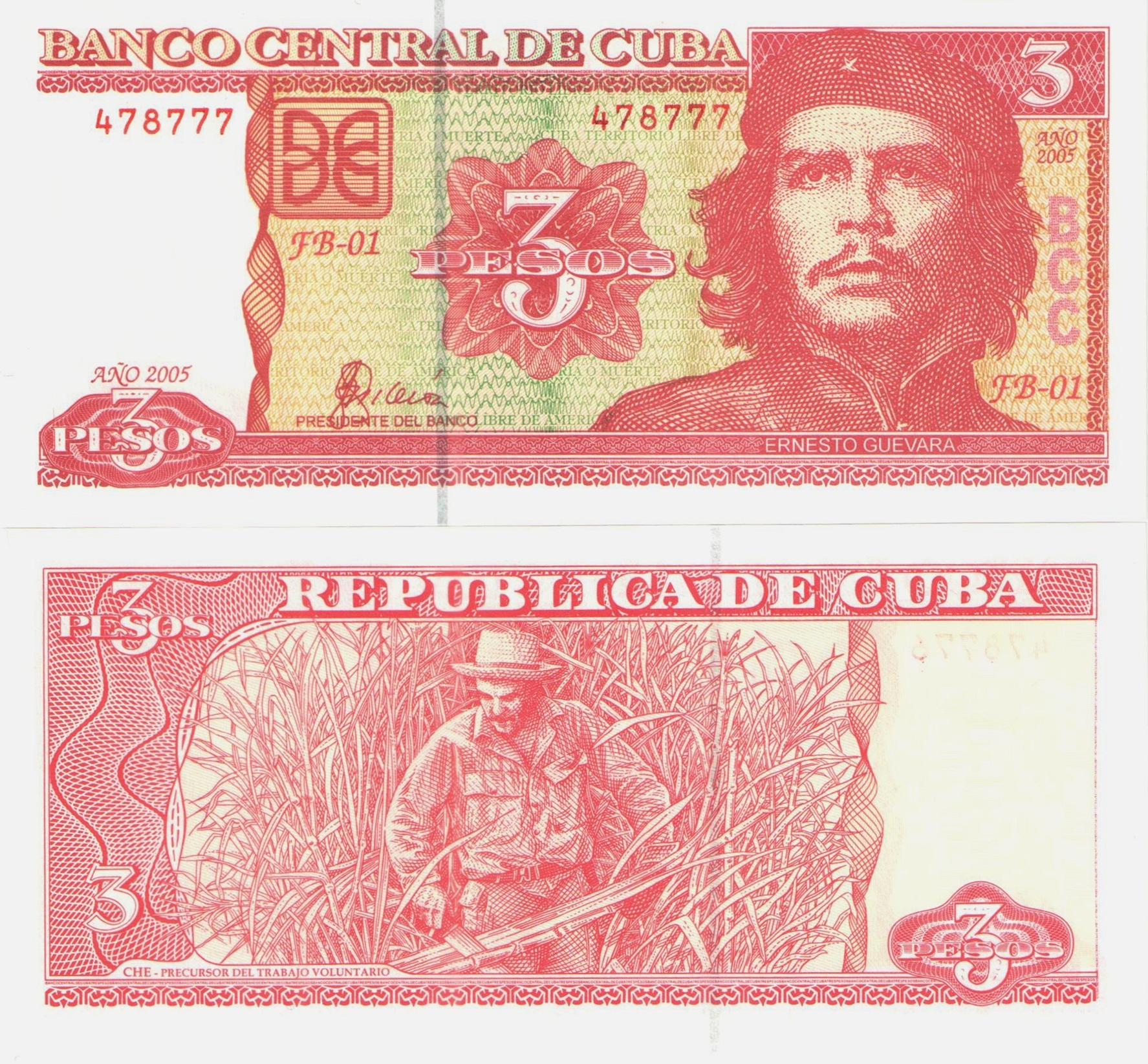 Лицевая сторона: в правой части банкноты мы можем увидеть портрет Эрнесто Чегавара - один из руководителей борьбы кубинского народа за независимость от испанского господства. Левее от него, по центру, надпись: "BANCO CENTRAL DE CUBA". В левом нижнем и правом верхнем углах указана цифра номинала: "3". По центру размещен номинал: "3 PESOS". В левой части банкноты год: "2005"