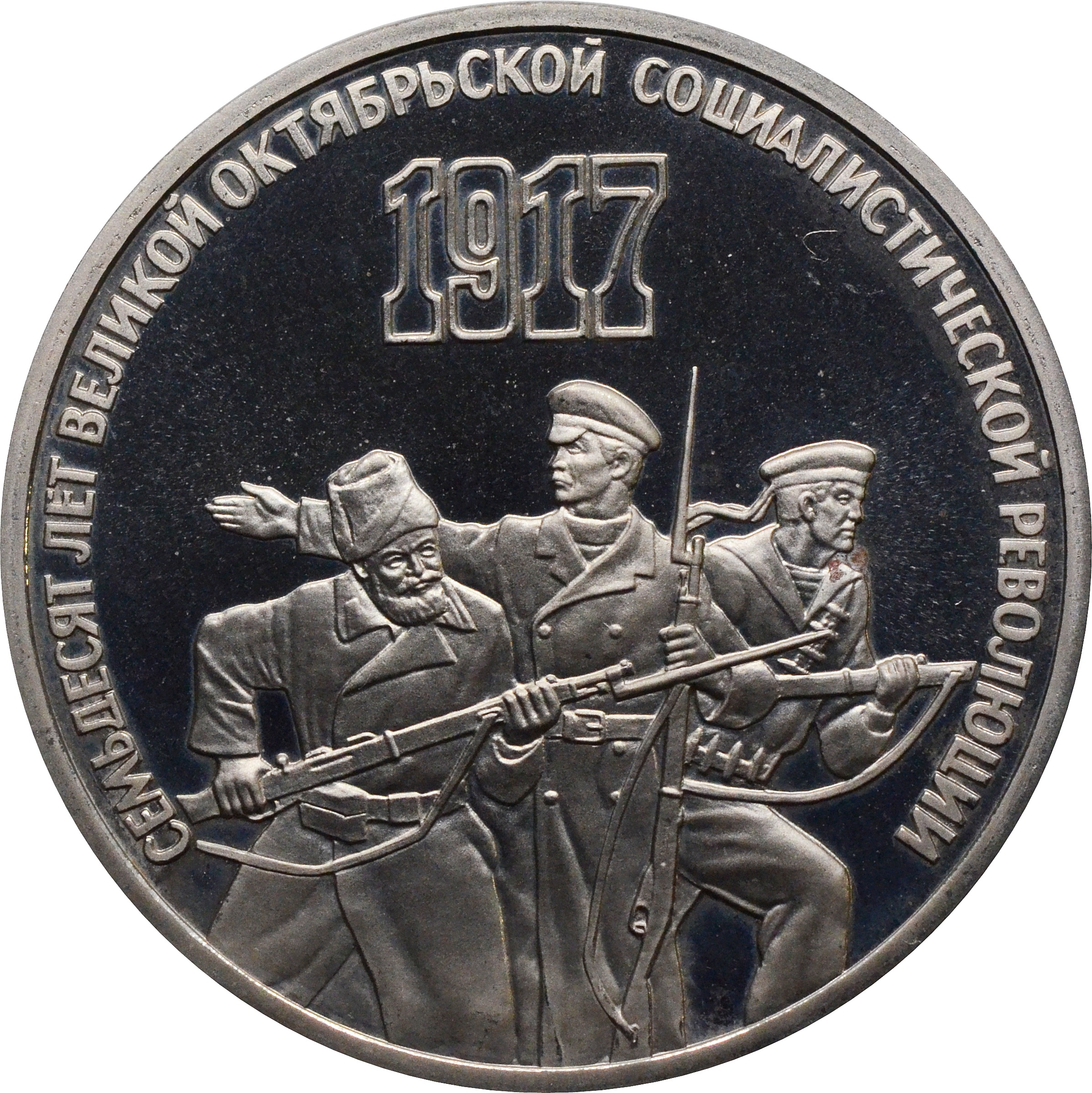 Реверс: по центру изображение солдат с указанием года: "1917". По краю монеты снизу вверх надпись: "СЕМЬДЕСЯТ ЛЕТ ВЕЛИКОЙ ОКТЯБРЬСКОЙ СОЦИАЛИСТИЧЕСКОЙ РЕВОЛЮЦИИ".