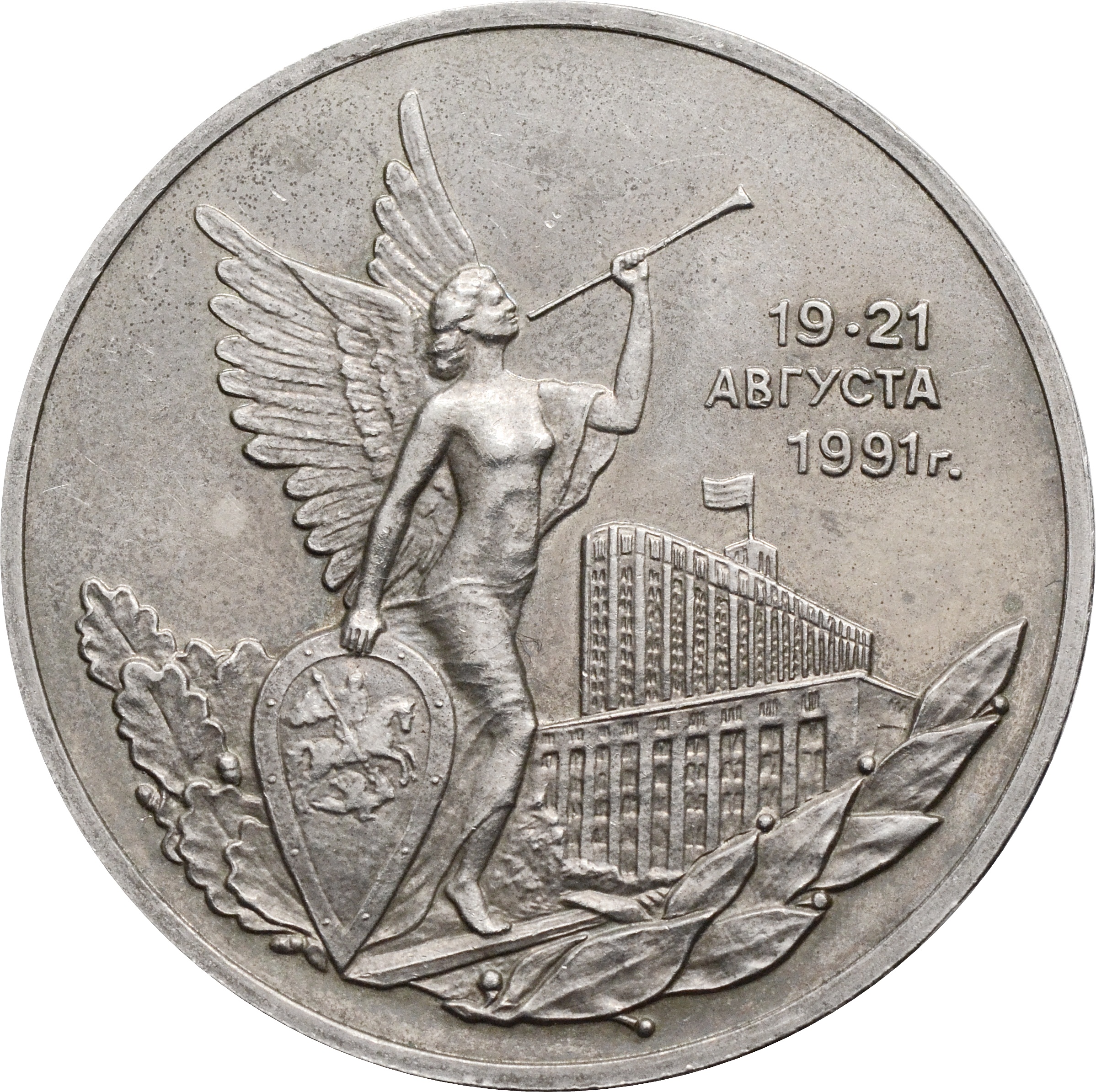 Реверс: в центре расположено символическое изображение богини Победы на фоне Дома Советов Российской Федерации в Москве, правой рукой опирающейся на щит с изображением герба Москвы, левой рукой держащей горн и попирающей ногой меч; справа от неё надпись в три строки: "19-21 АВГУСТА", в нижней части слева и справа от изображения - дубовая и лавровая ветви.